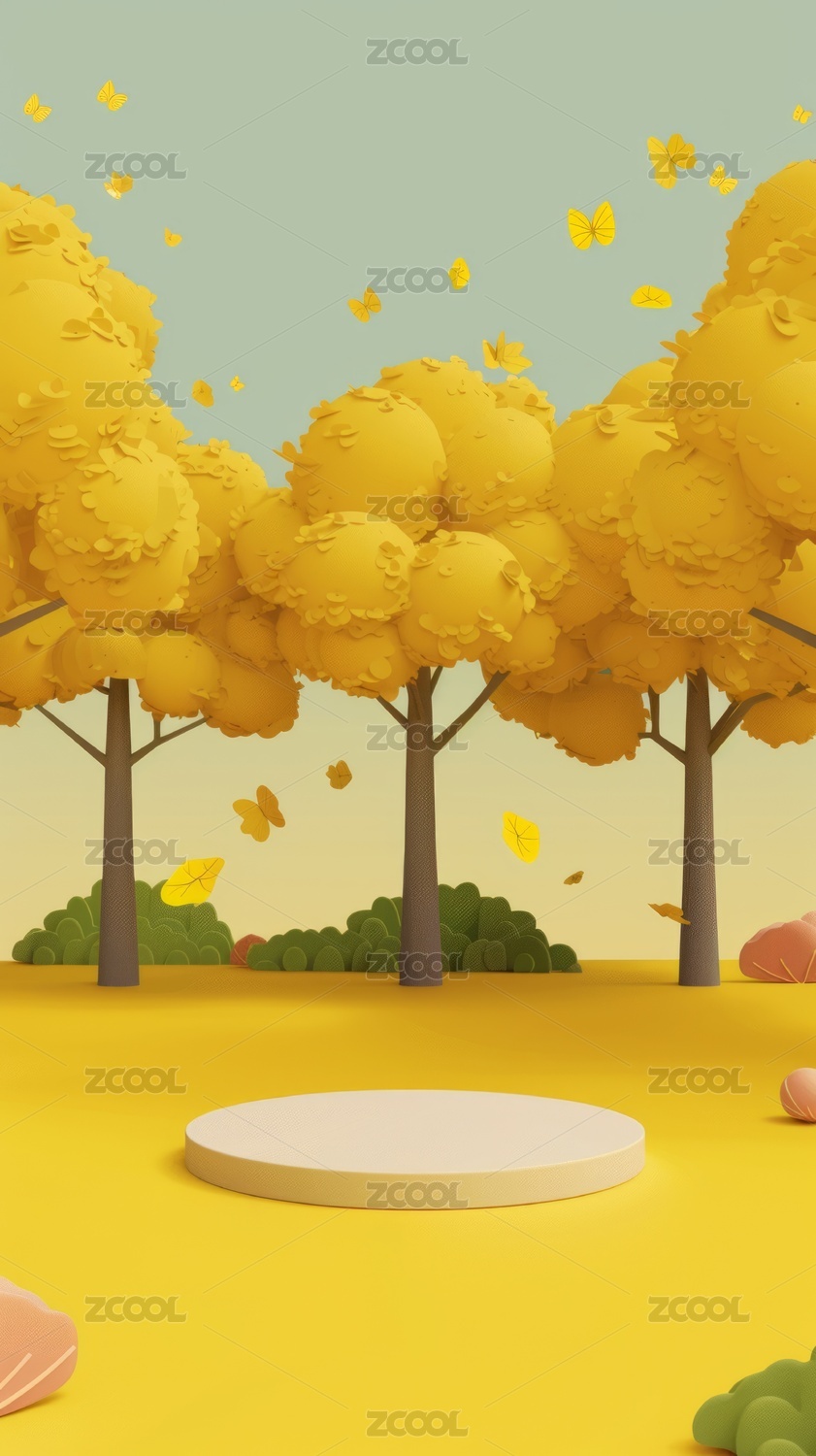 产品展台背景:3D黄色森林树木产品展台背
