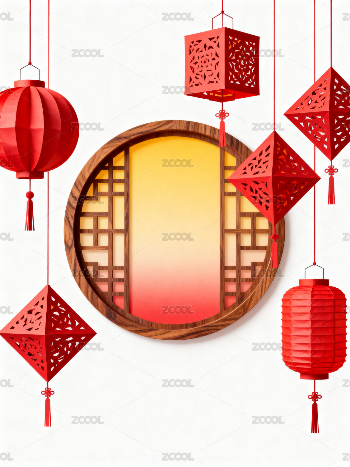红色灯笼与木质窗格装饰