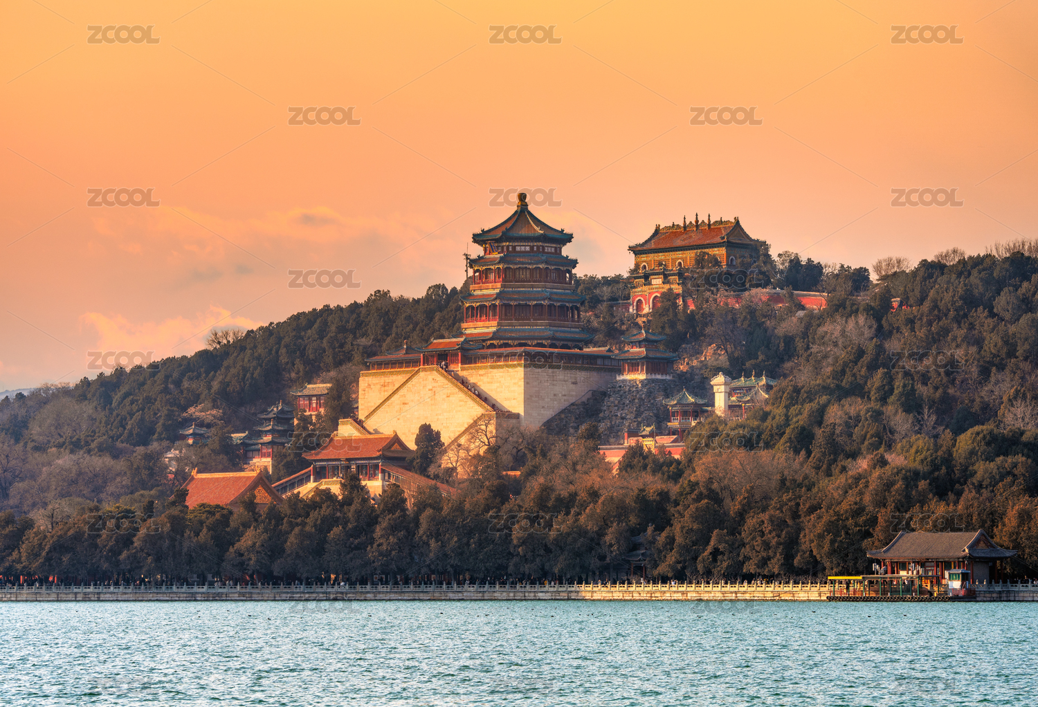 北京颐和园古建筑落日风光