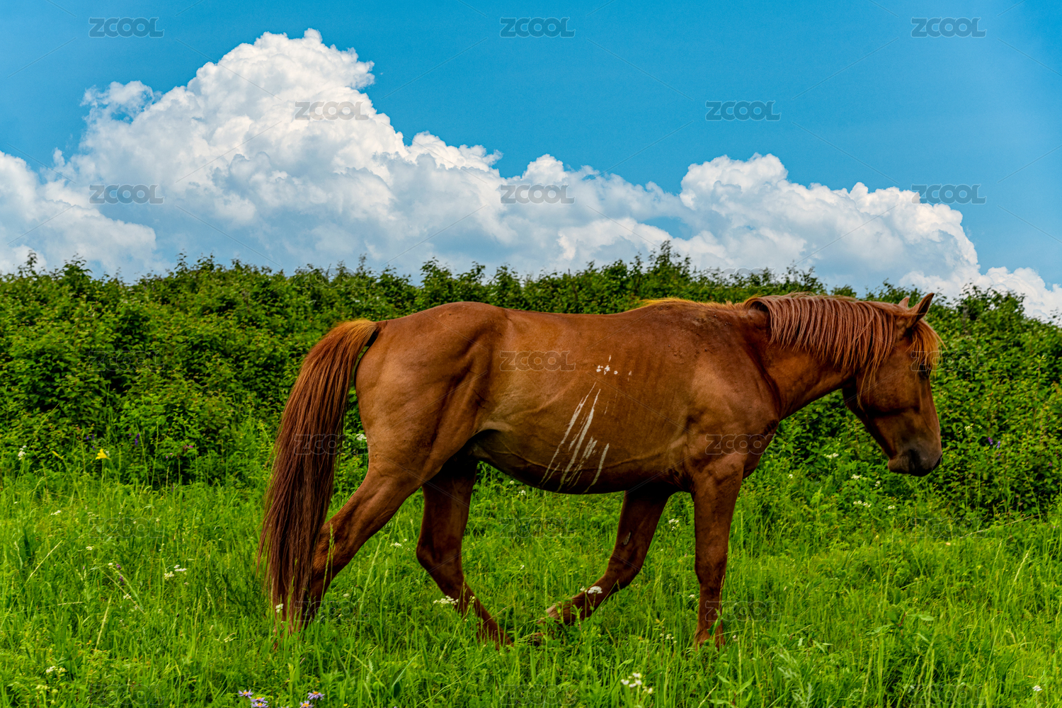 在蓝天白云下天然草原牧场上吃草的马群
