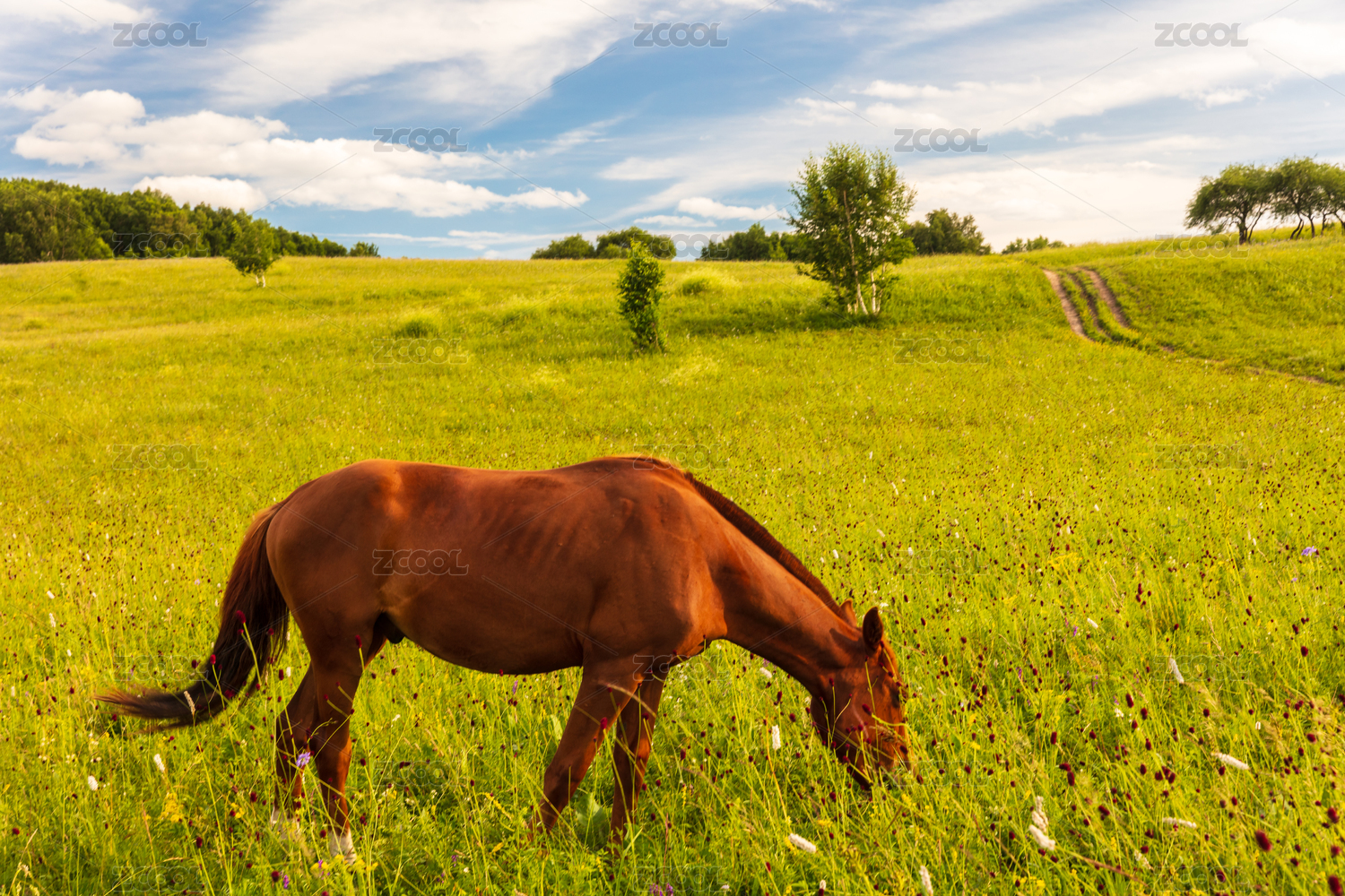 草原上低头吃草的骏马