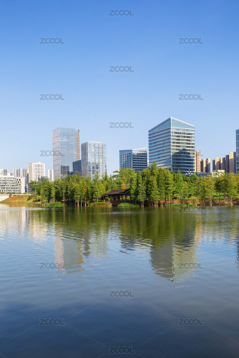 四川成都桂溪生态公园湖泊和现代建筑远景
