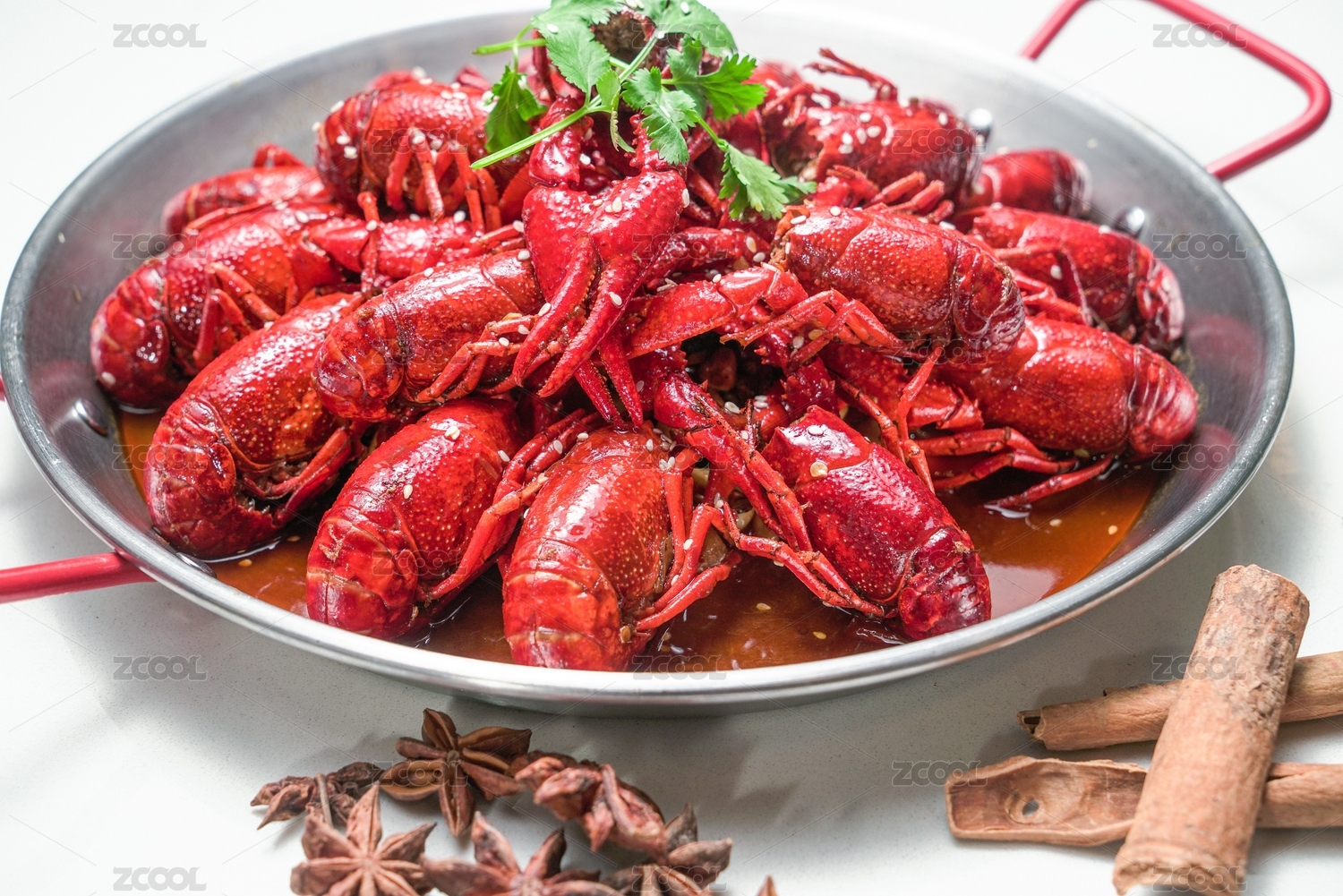 中国传统美食麻辣小龙虾整齐的装在铁锅中