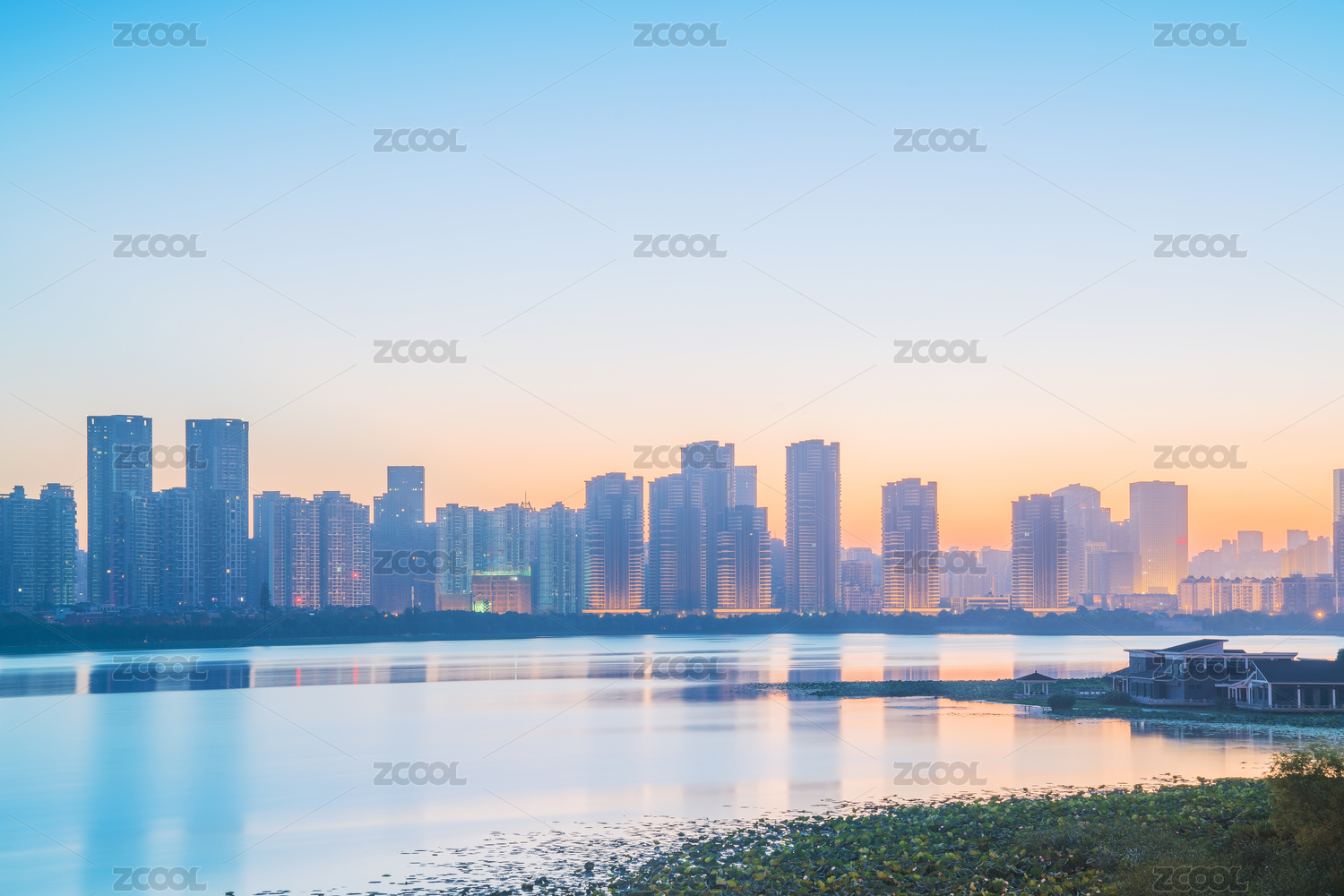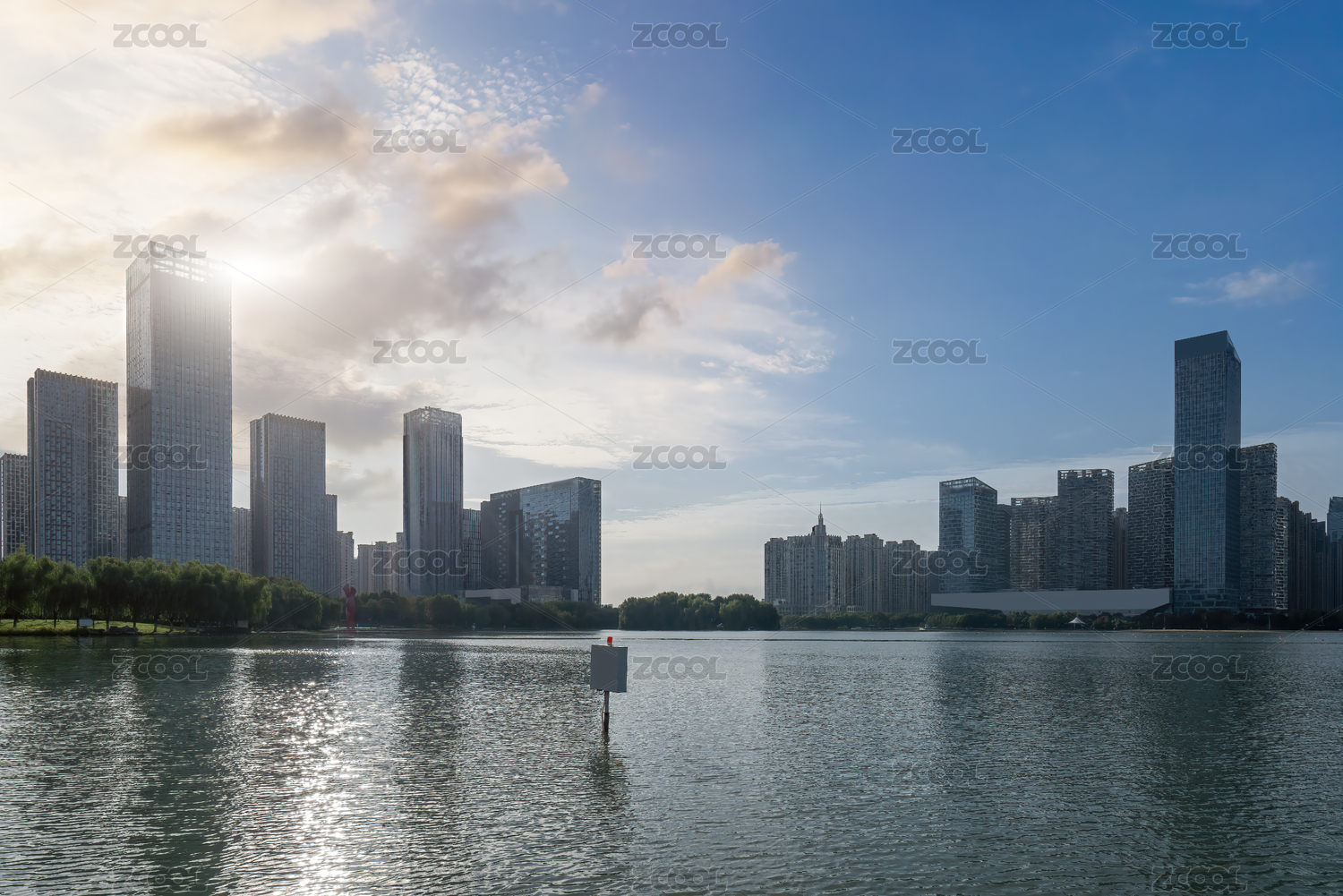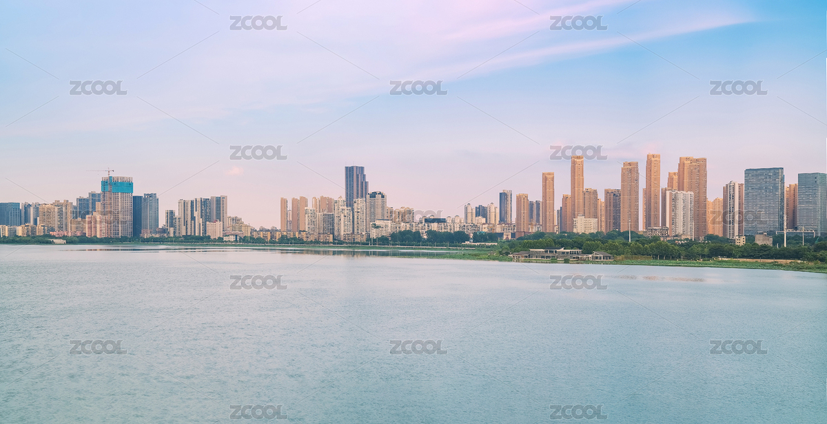 中国南京空旷的湖面及现代城市建筑天际线