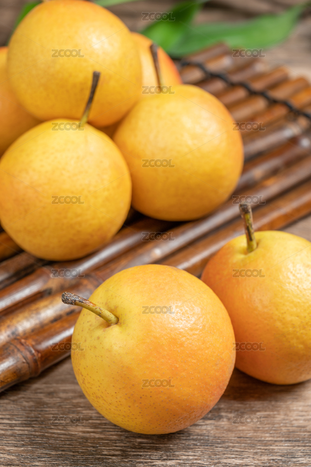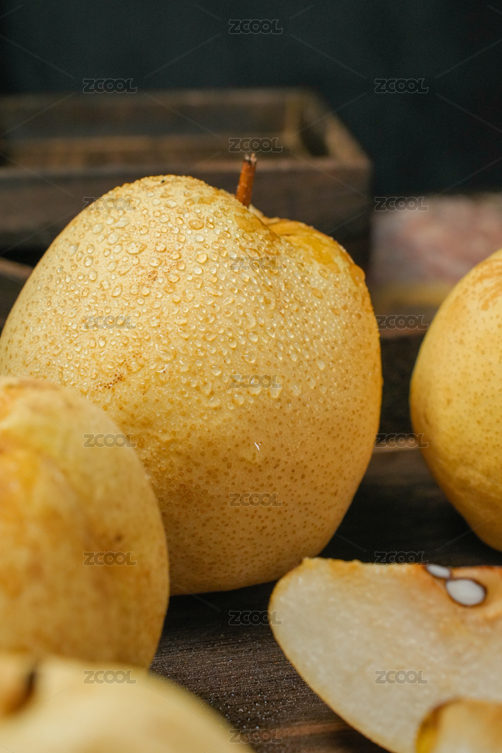 木板上放着一个完整赵州雪梨和一个削皮酥梨