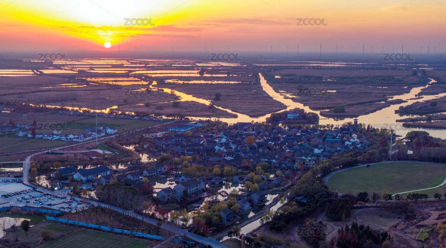 远看中国上海市青浦区朱家角乡村日落时刻