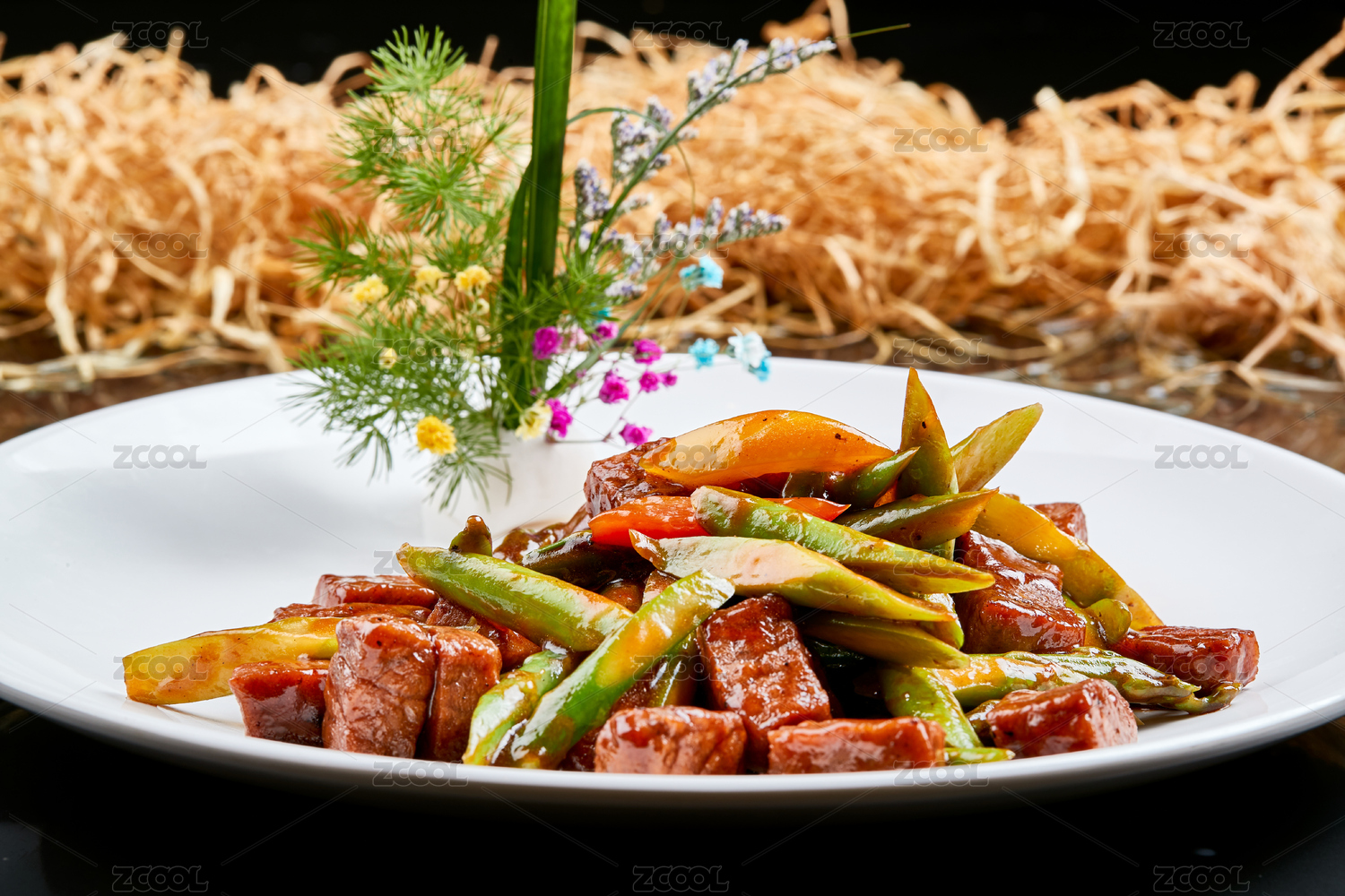 白色瓷盘装的黑胡椒鲜芦笋小炒牛仔粒