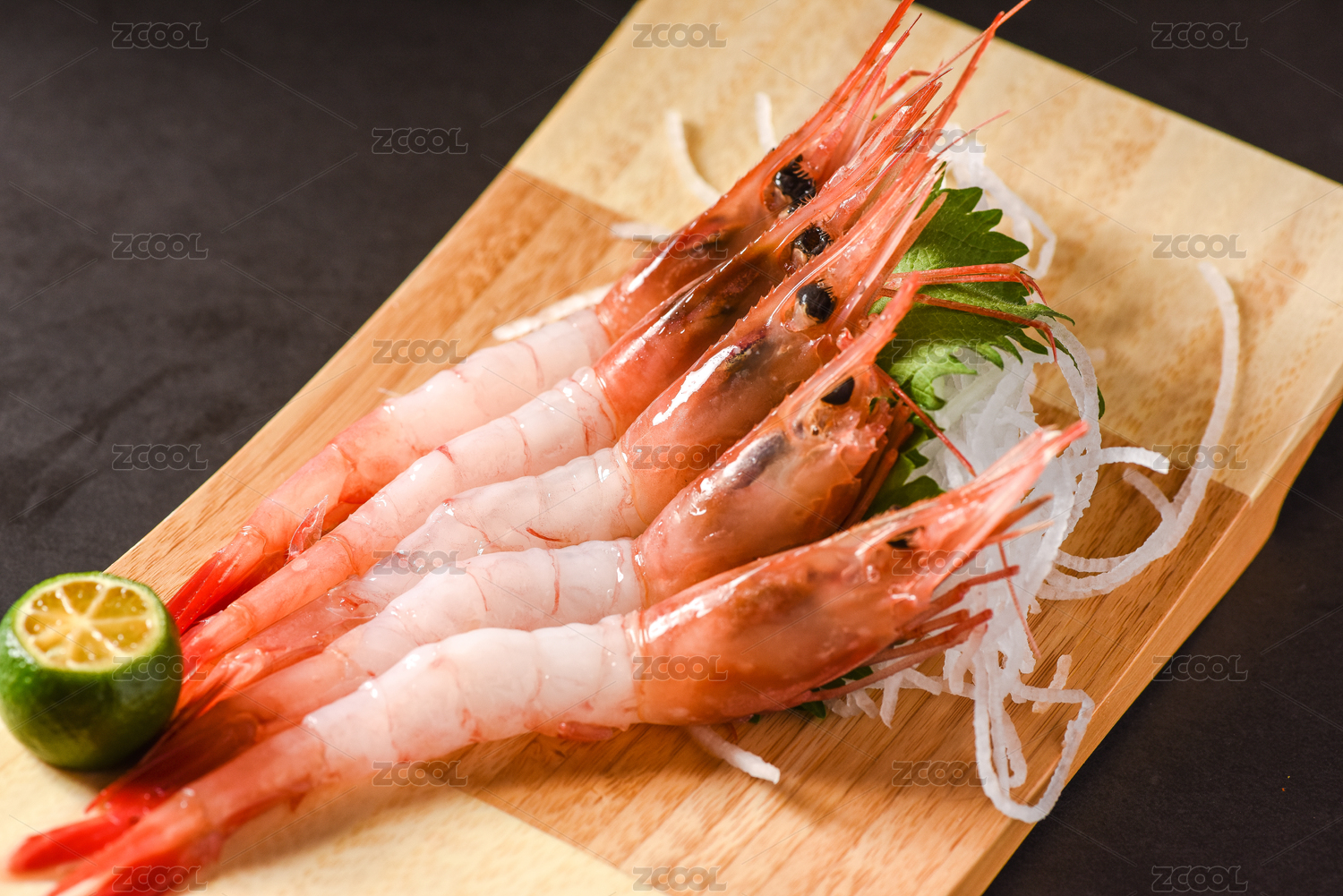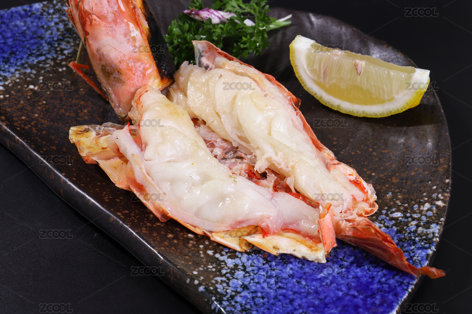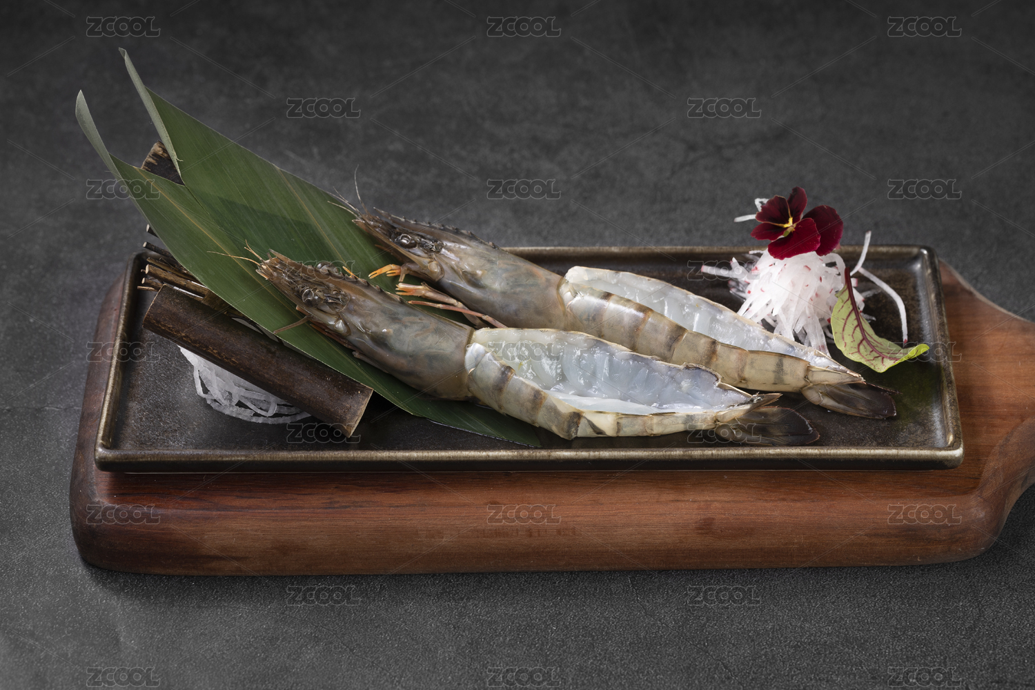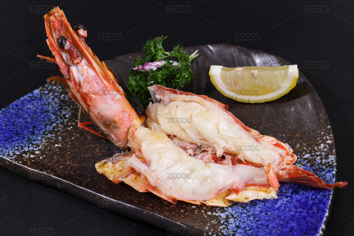 长方形瓷盘装的铁板野生明虾皇摆放在草垫上