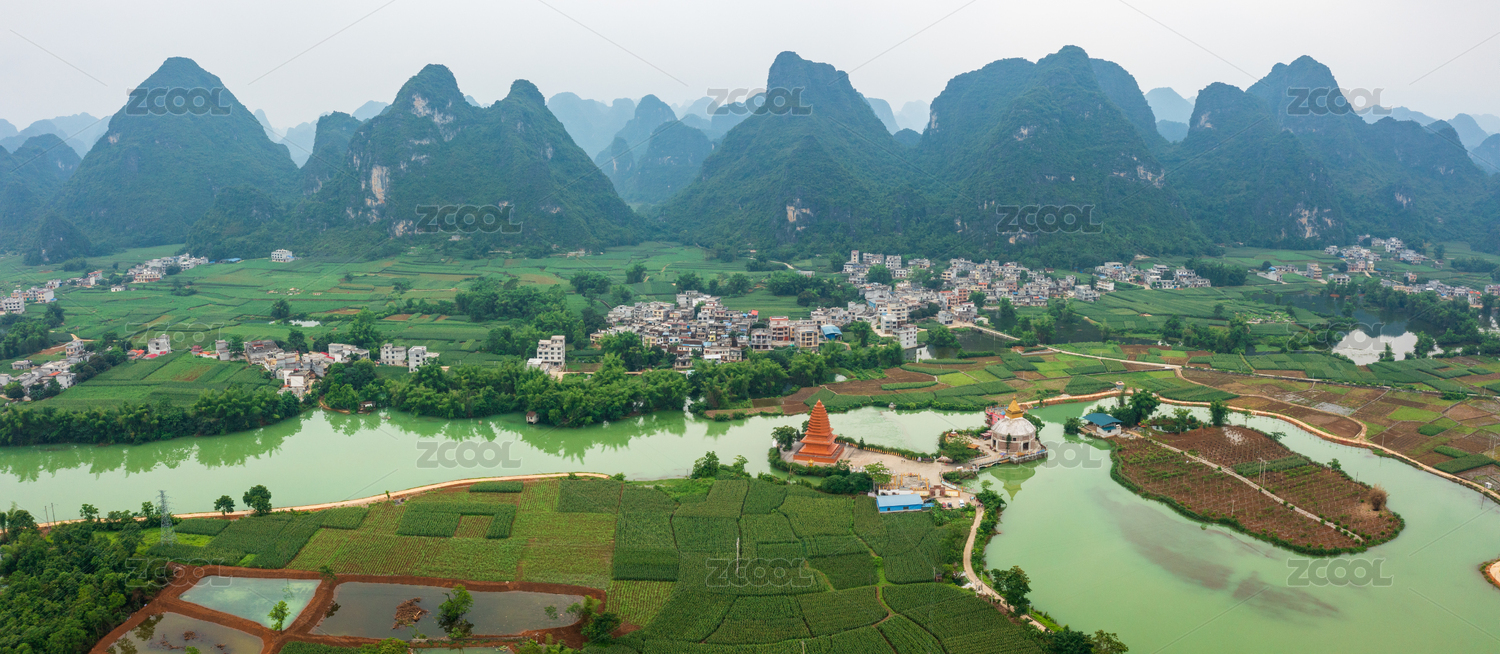 桂林阳朔兴坪古镇漓江沿岸自然风光山水航拍