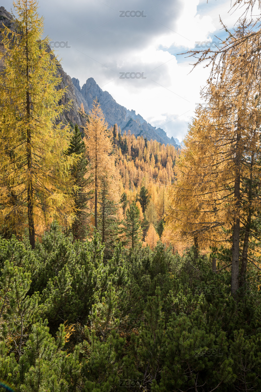 秋季多洛米蒂山间的树林