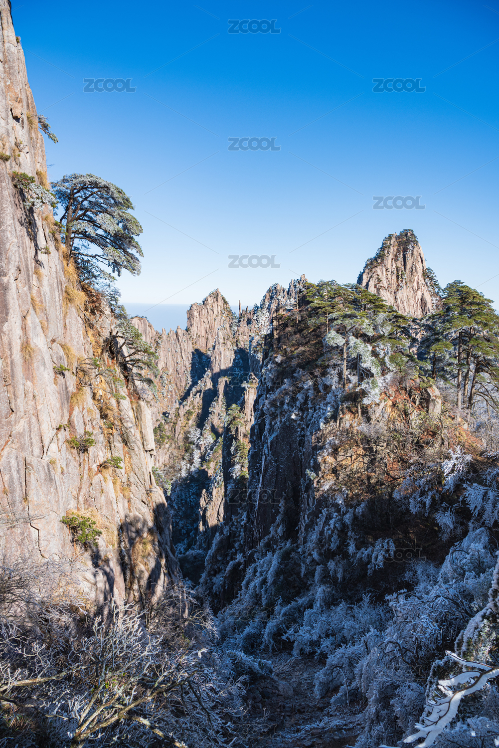 中国安徽黄山风景区,冬日雪后奇峰怪石林立、云雾飘渺宛若仙境