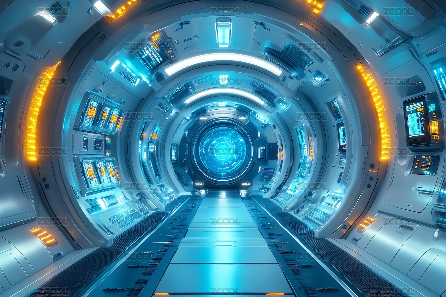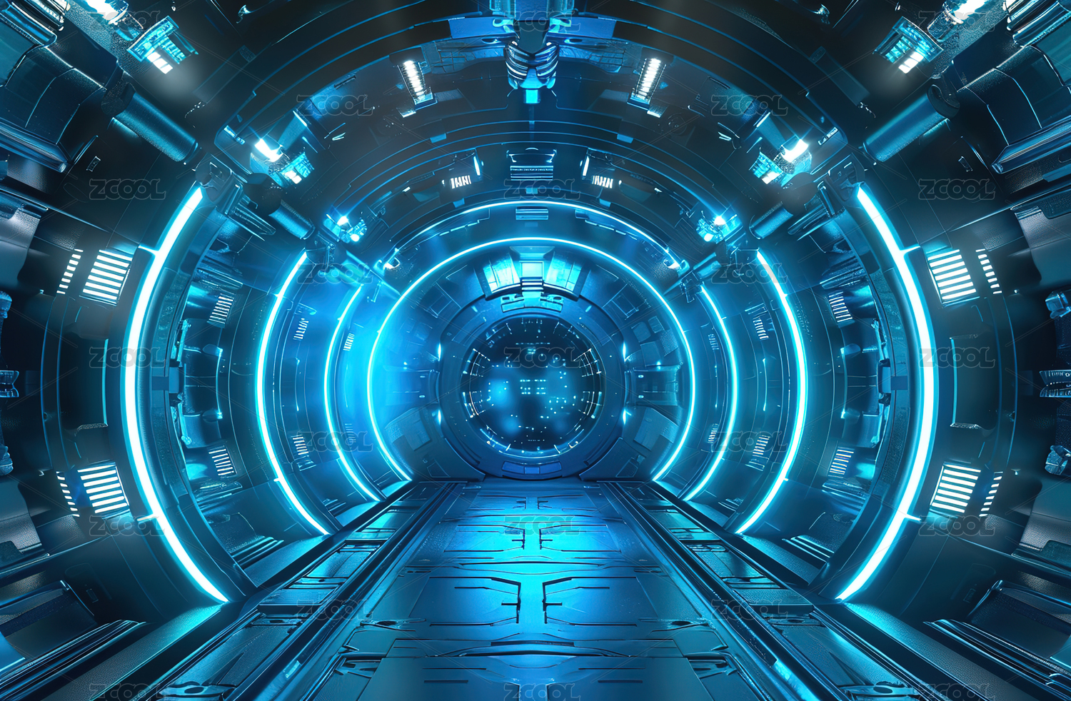 蓝色科幻空间太空仓内部,科技空间广场平台