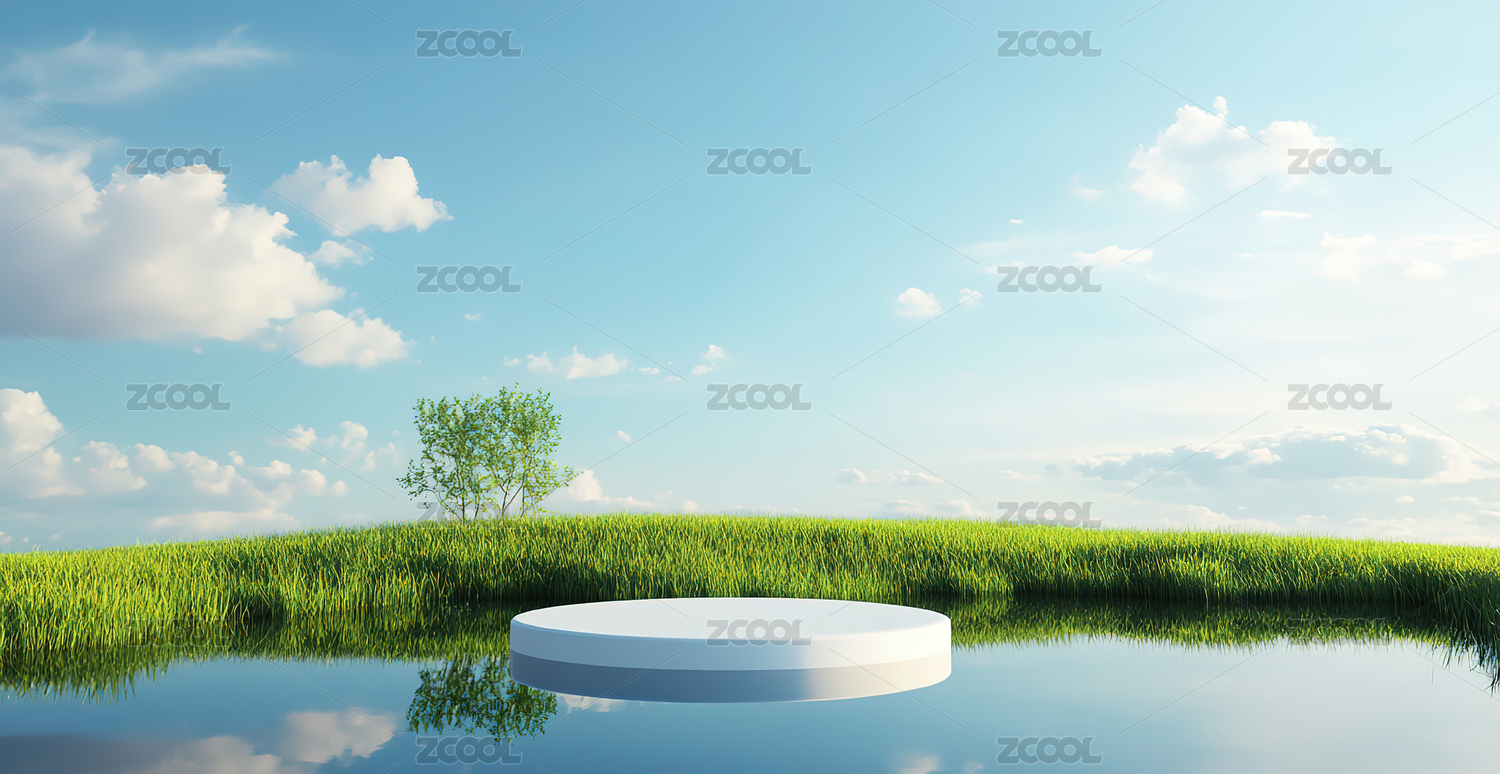 绿色草地与水面圆形平台