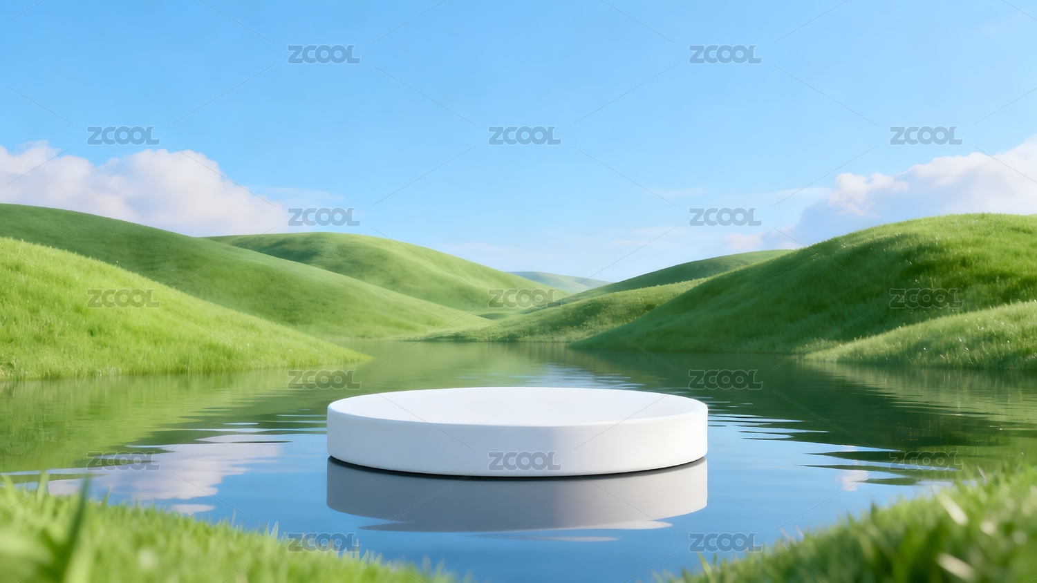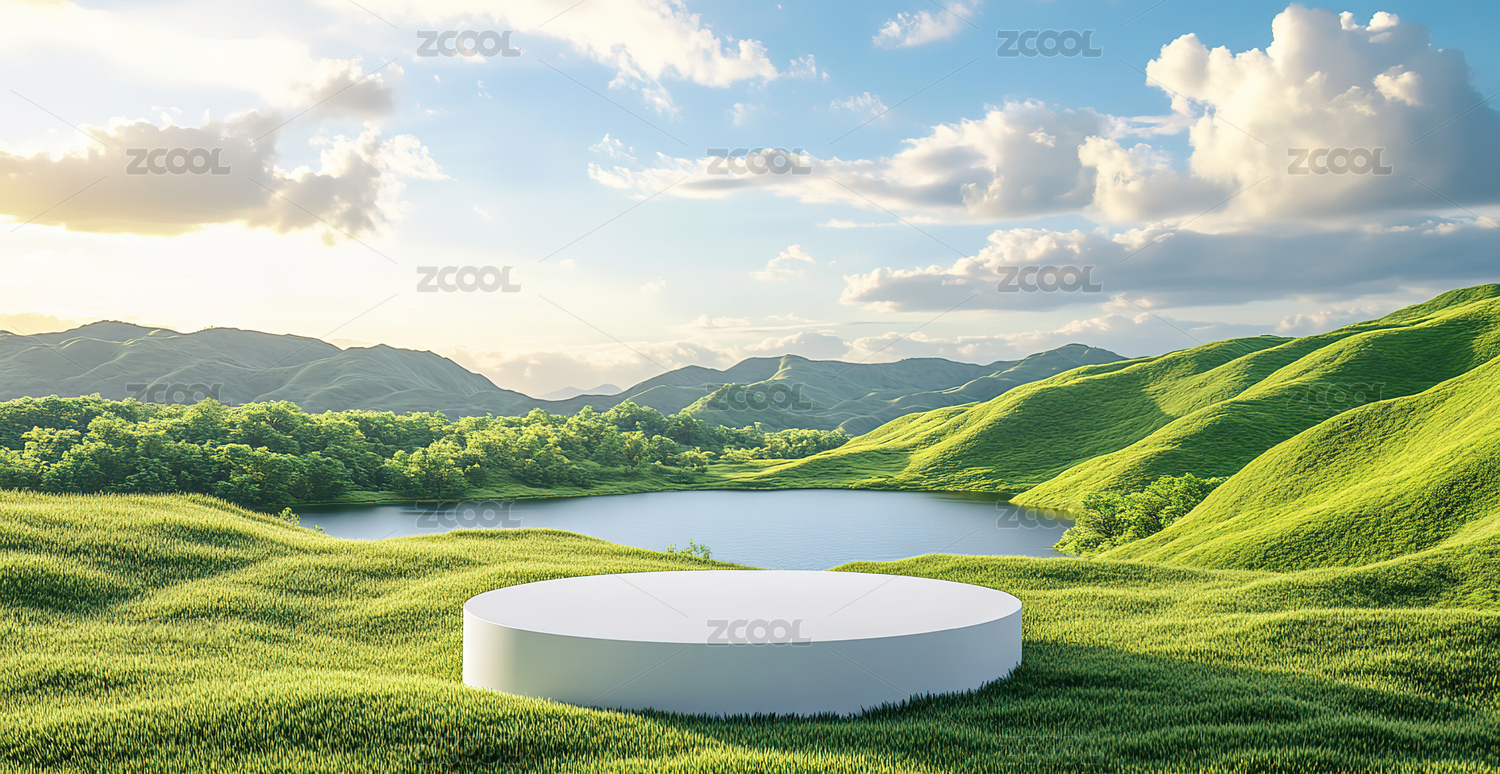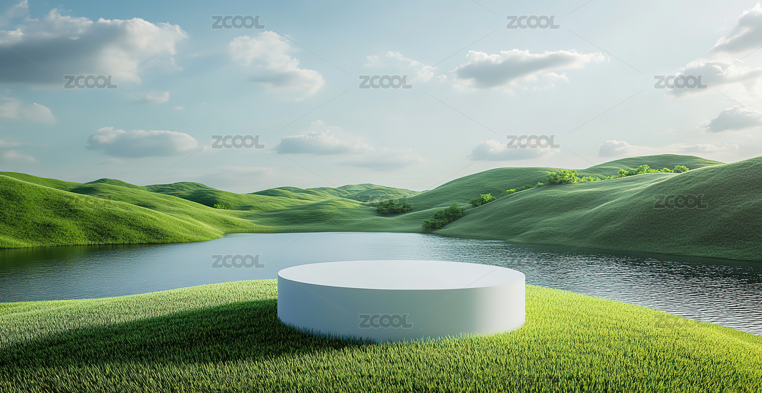 草地丘陵与水面圆形平台