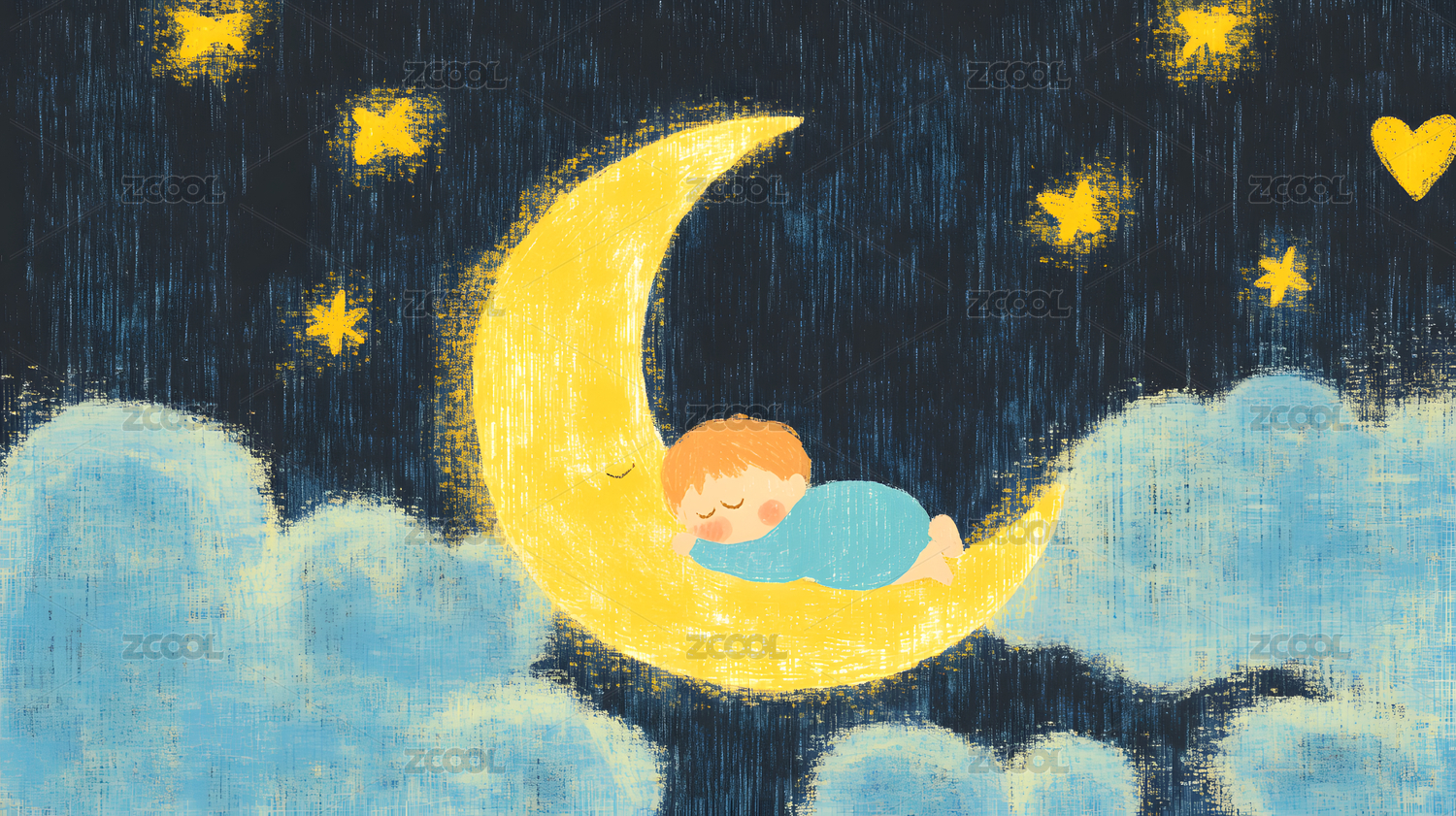 夏天星空下少女坐在月亮上弹吉他,草坪上的鹿和小鸟在围观嬉戏插画背景海报