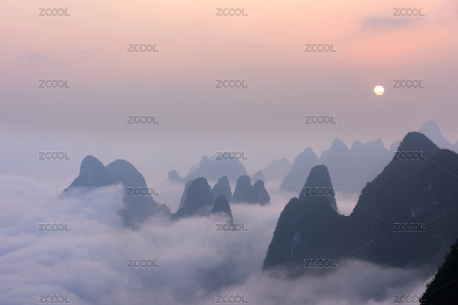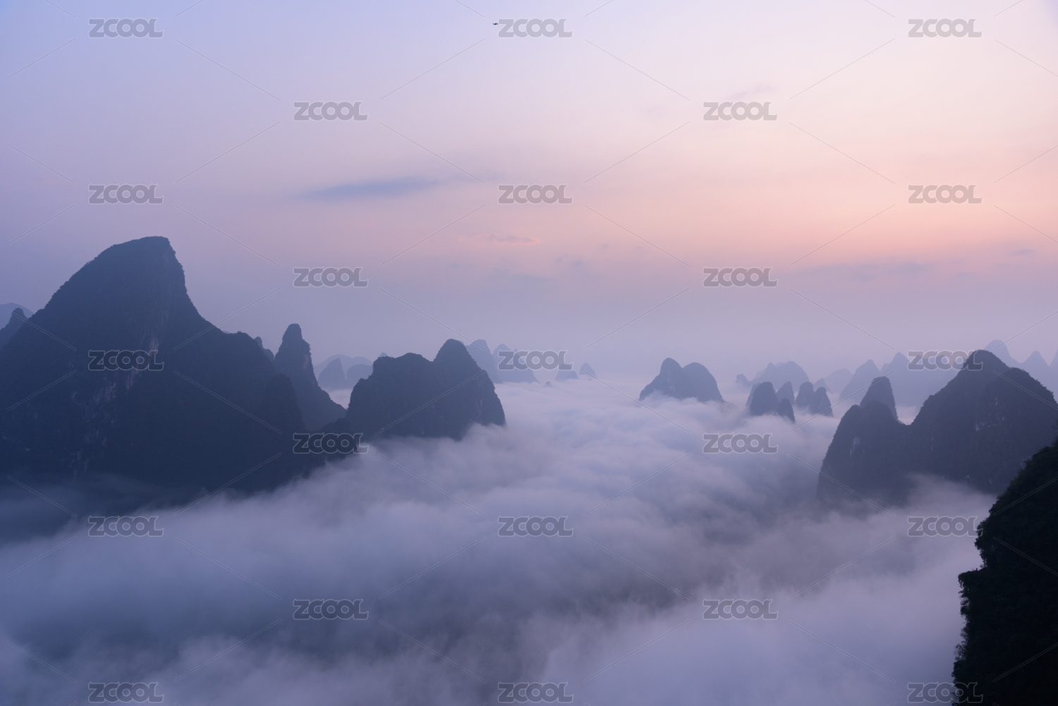 春天日出时分桂林漓江峡谷上空的云海