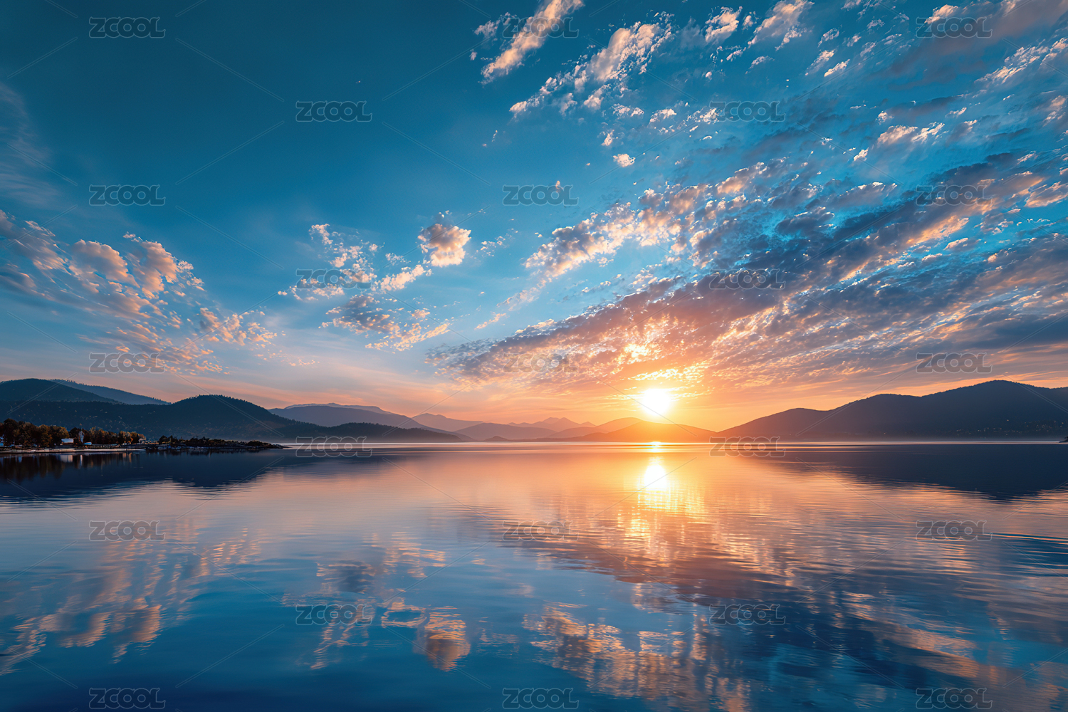 夕阳下的群山对峙的湖景