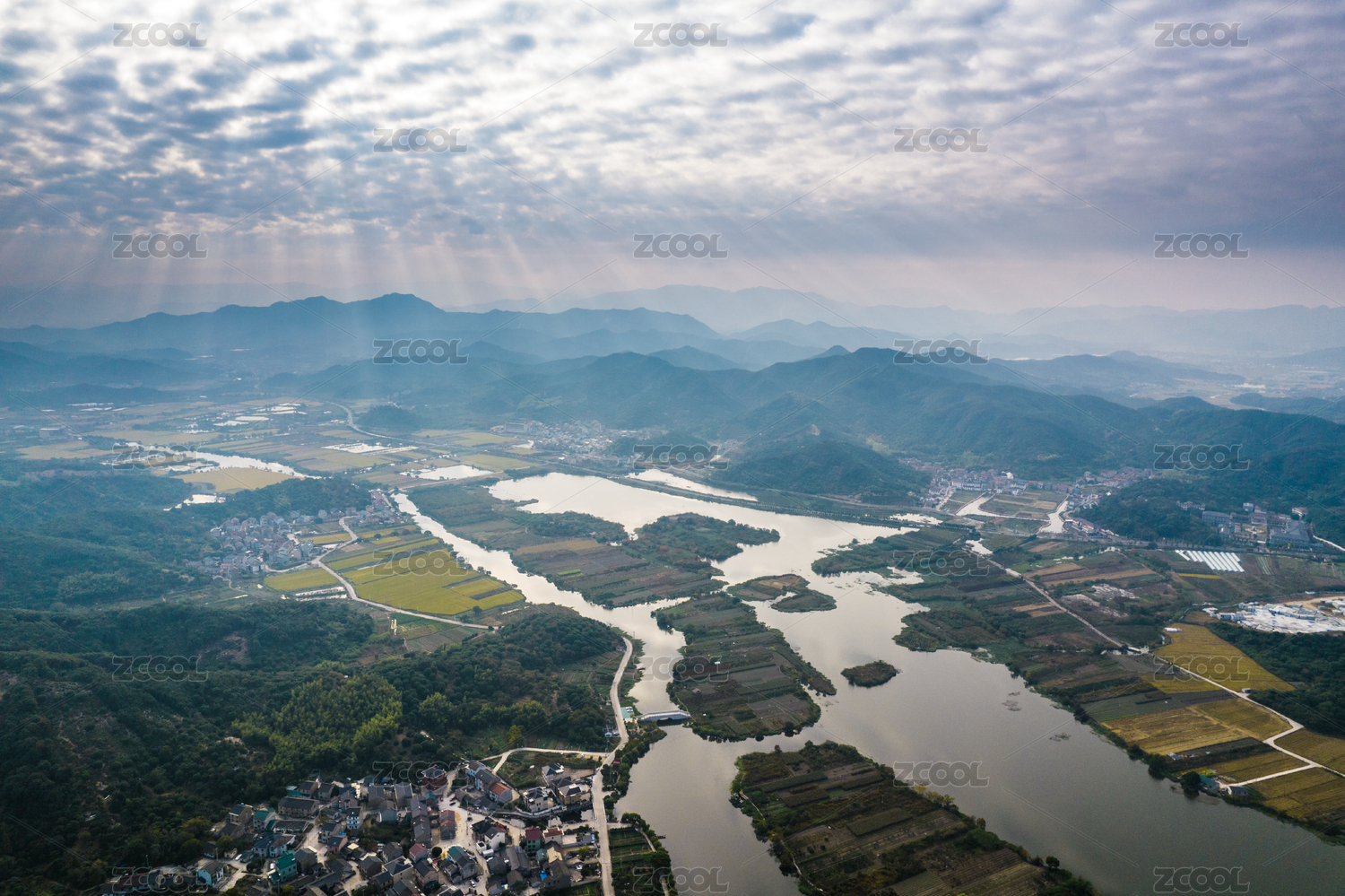 航拍秋日傍晚浙江上虞丁宅乡山村美景