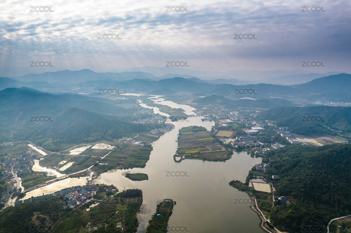 中国浙江省杭州市建德梅城镇沿江风光航拍