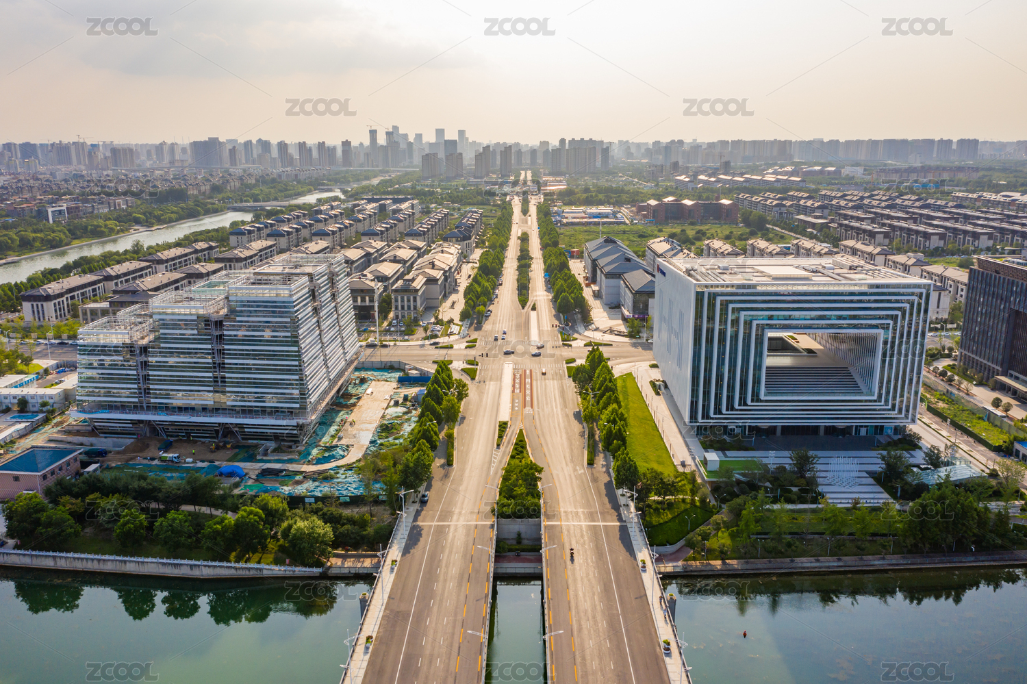 航拍河南郑州郑东新区城市水系河道水网交错