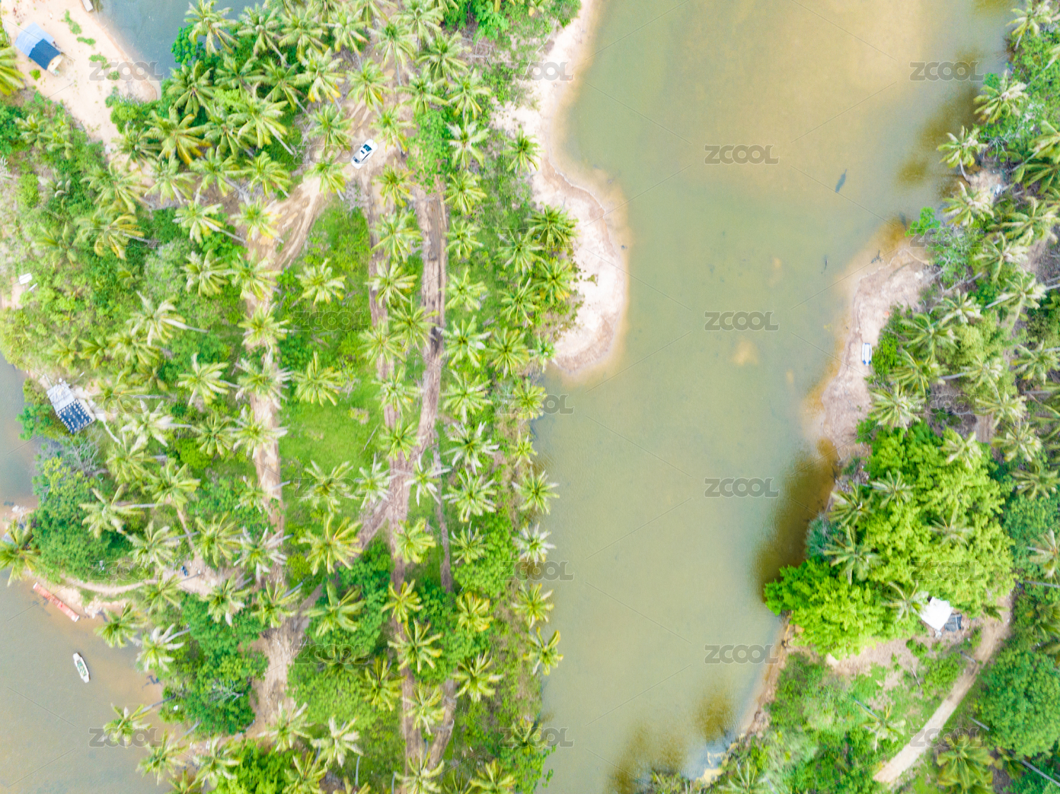 航拍海南海口白沙门公园椰林椰树郁郁葱葱