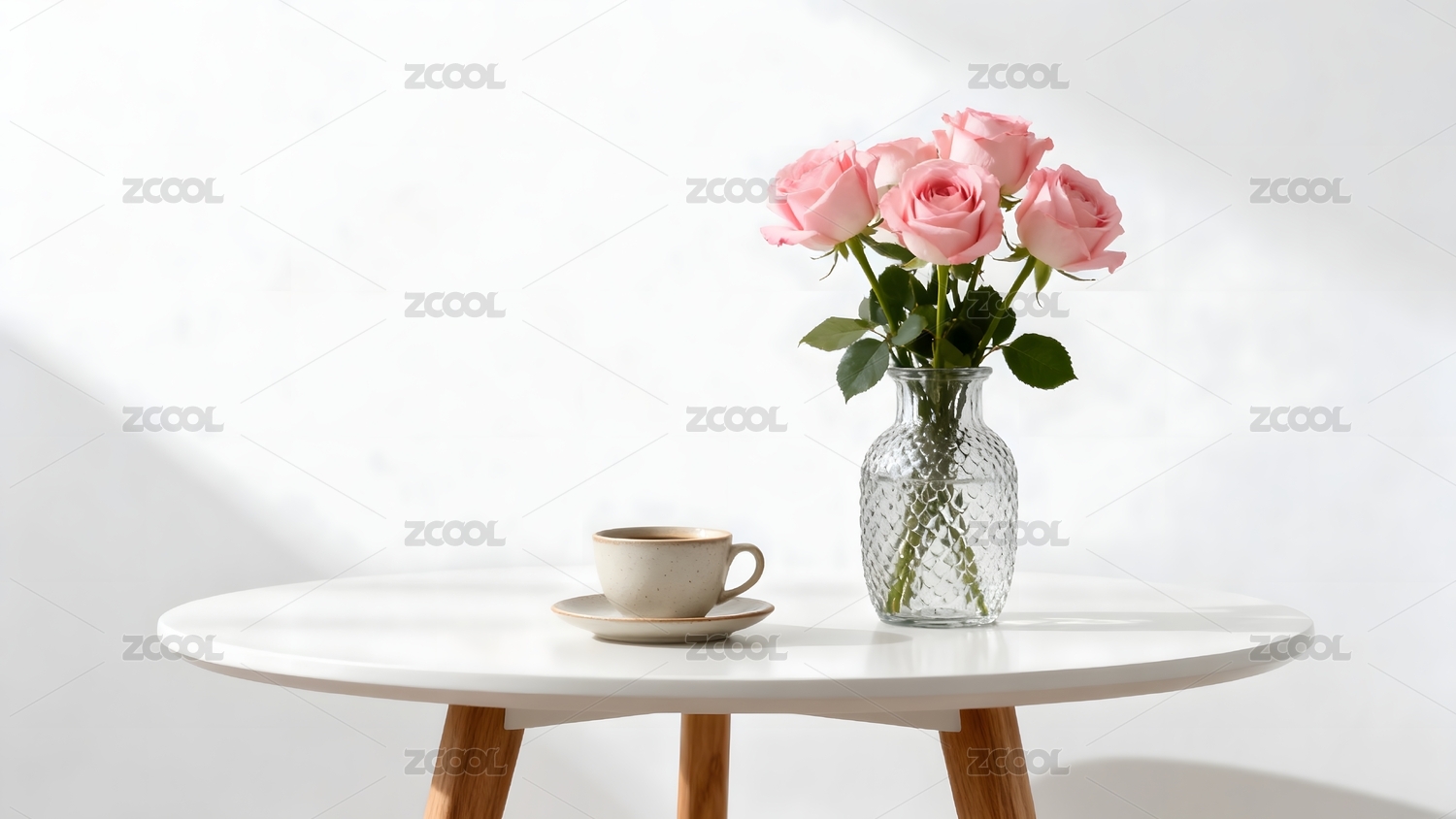 窗台边木桌上花瓶里粉红色玫瑰花束