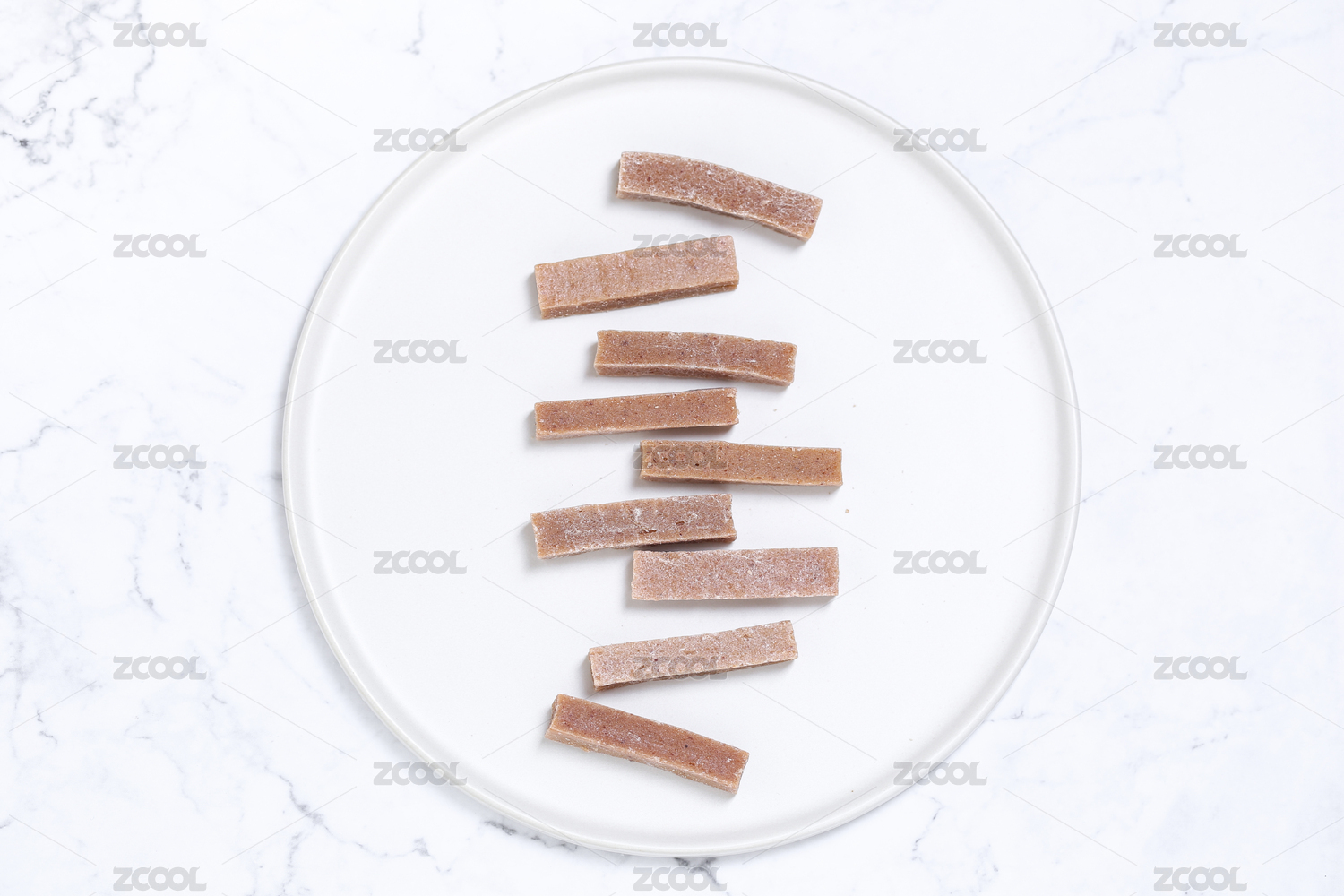 桌面上的盘子里的美味可口的夹心山楂奶糕