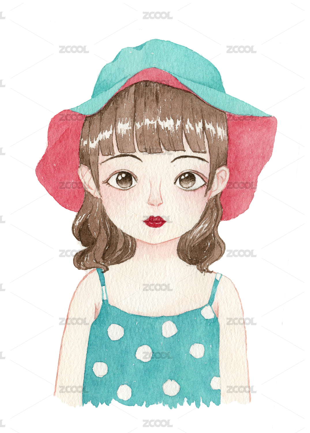 戴蓝色帽子穿蓝色吊带的小女孩 水彩插画