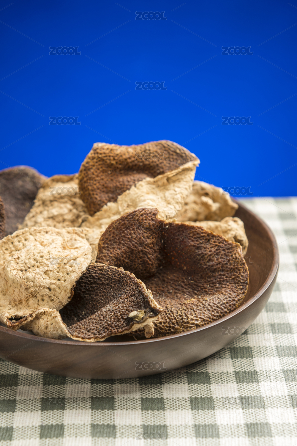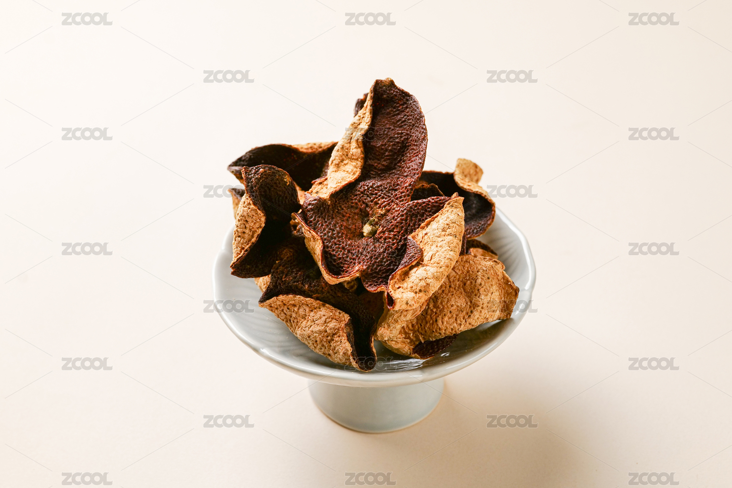 中药材陈皮与陈皮茶摆放在桌面上特写