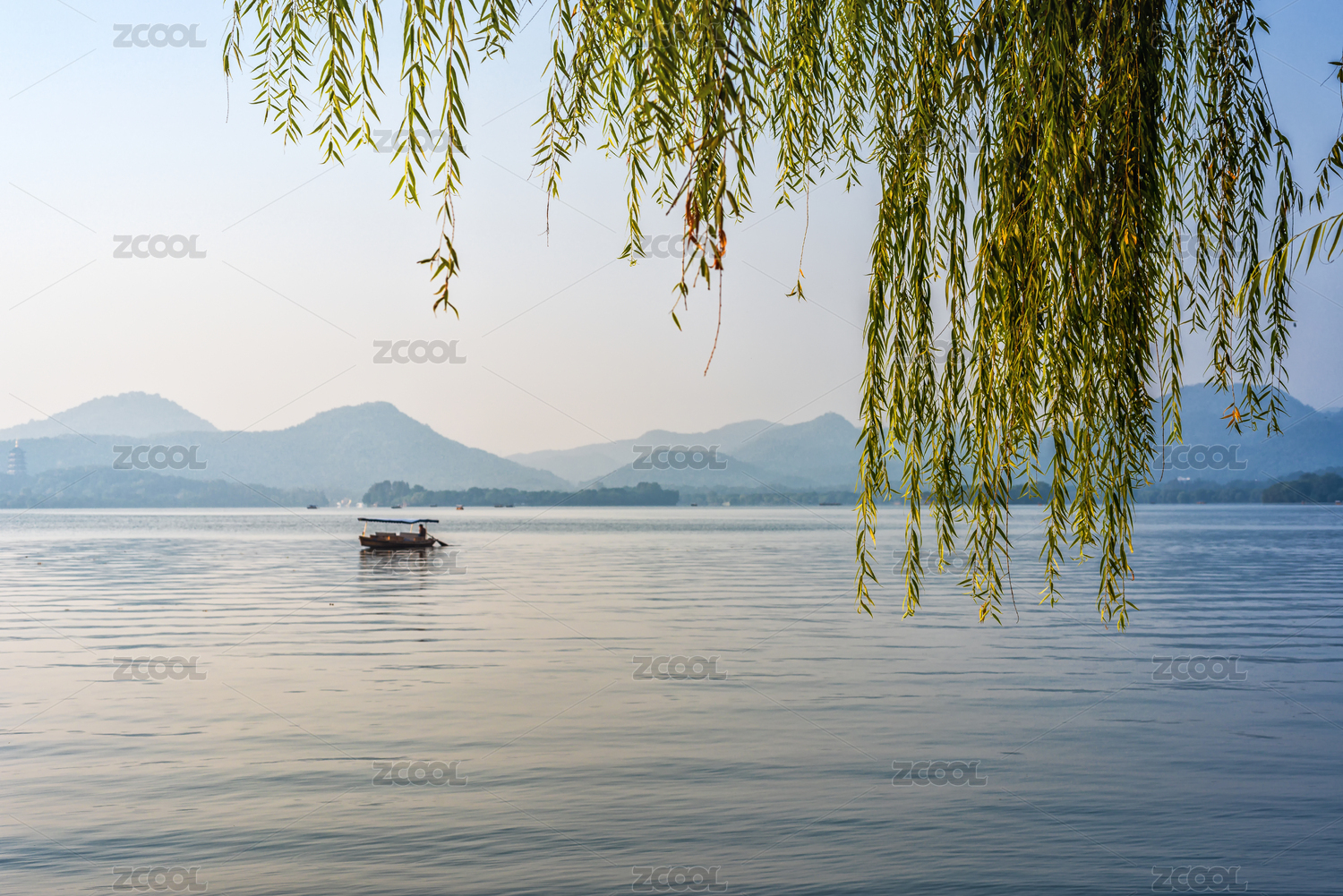 中国浙江杭州西湖风光,西湖垂柳与西湖手摇船