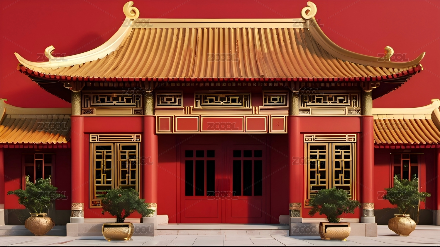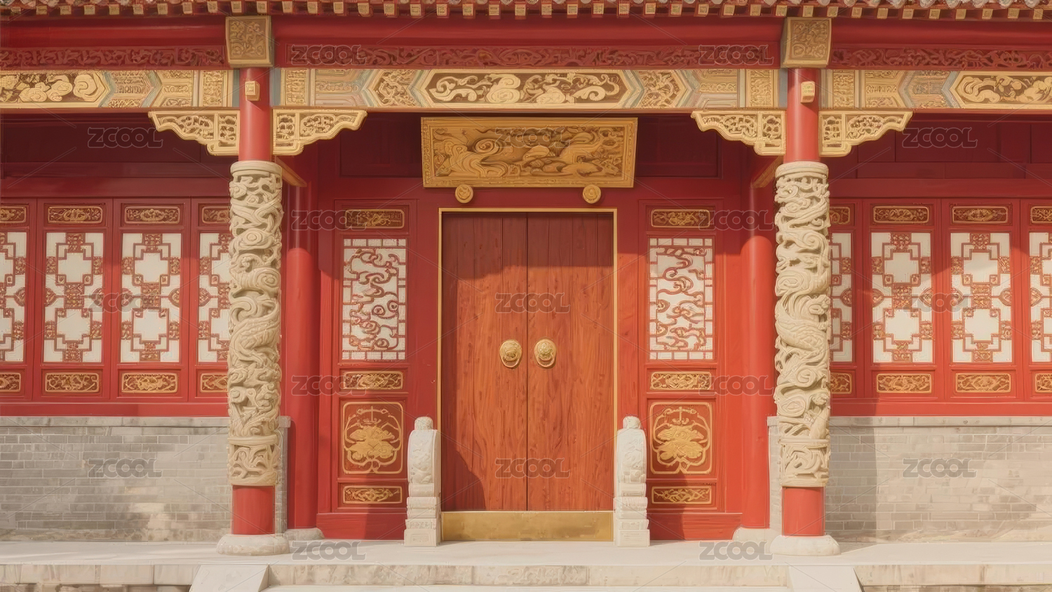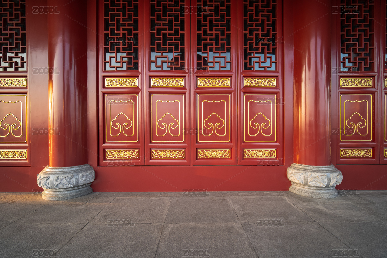 中国传统建筑局部,金碧辉煌用金色边框窗户