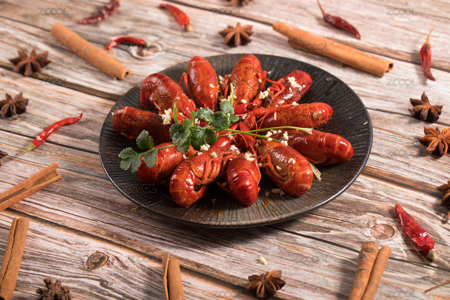 放在黑色盘子里的蒜蓉小龙虾旁边还放着八角香料