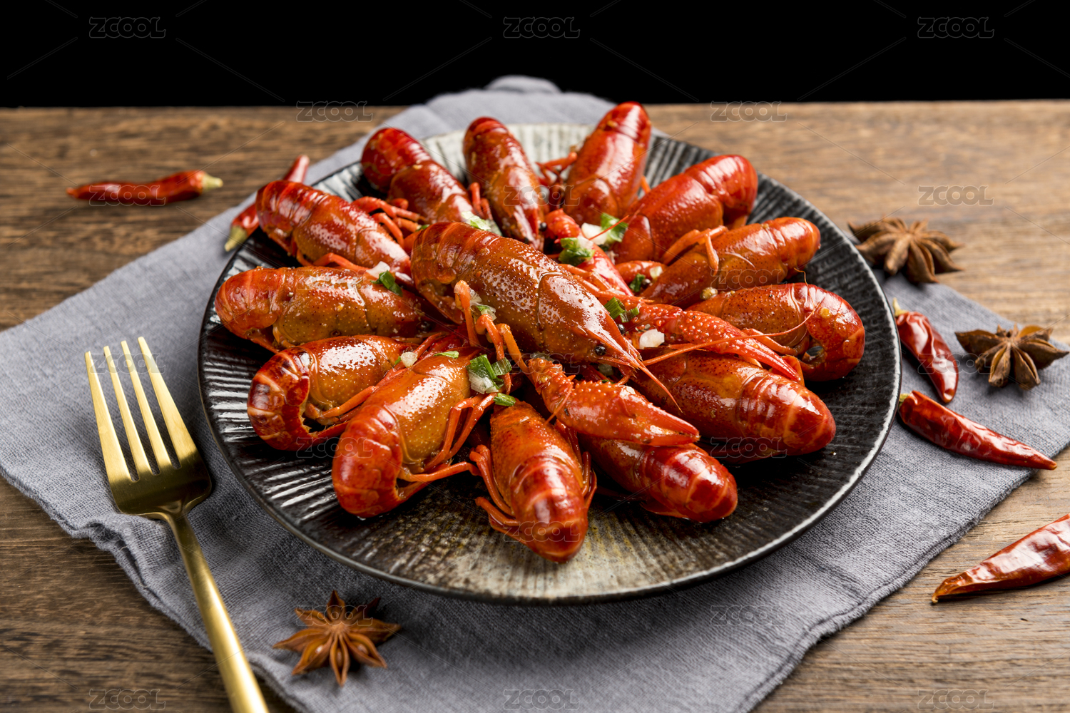 装在黑色盘子里放在木桌上的香辣小龙虾
