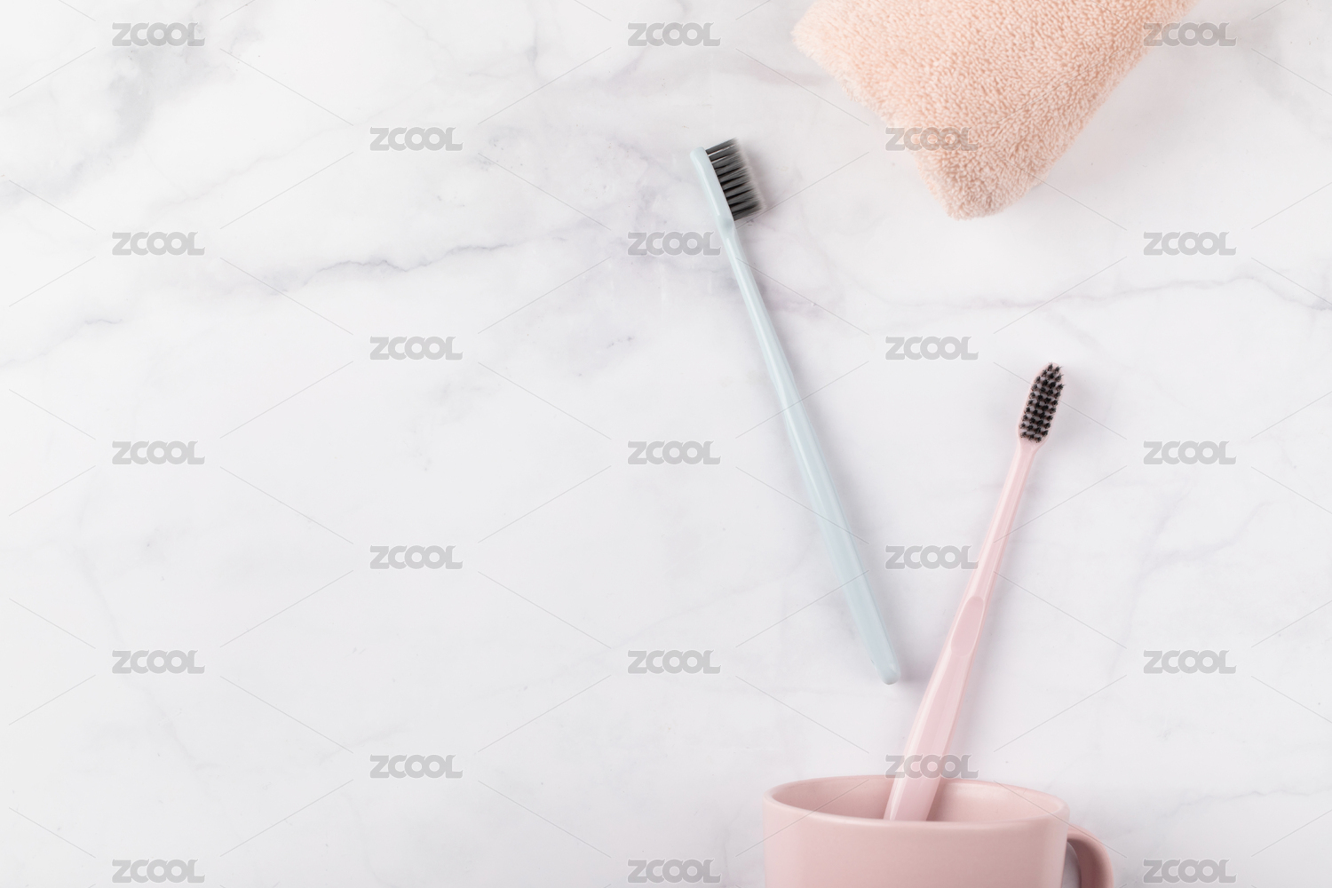 白色大理石背景上的毛巾和牙刷