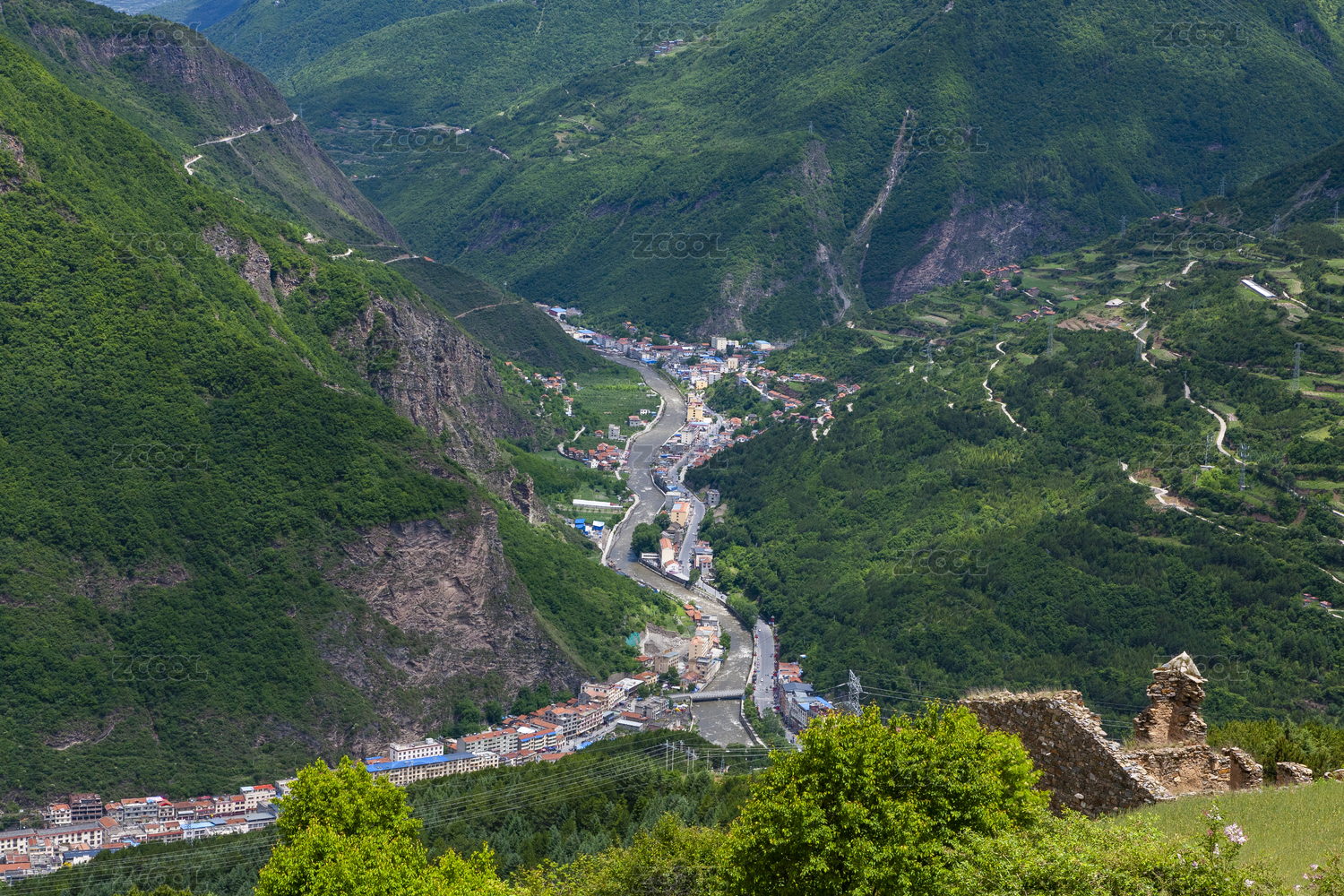 在阿坝黑水县德青郎寺观黑水县城峡谷全景