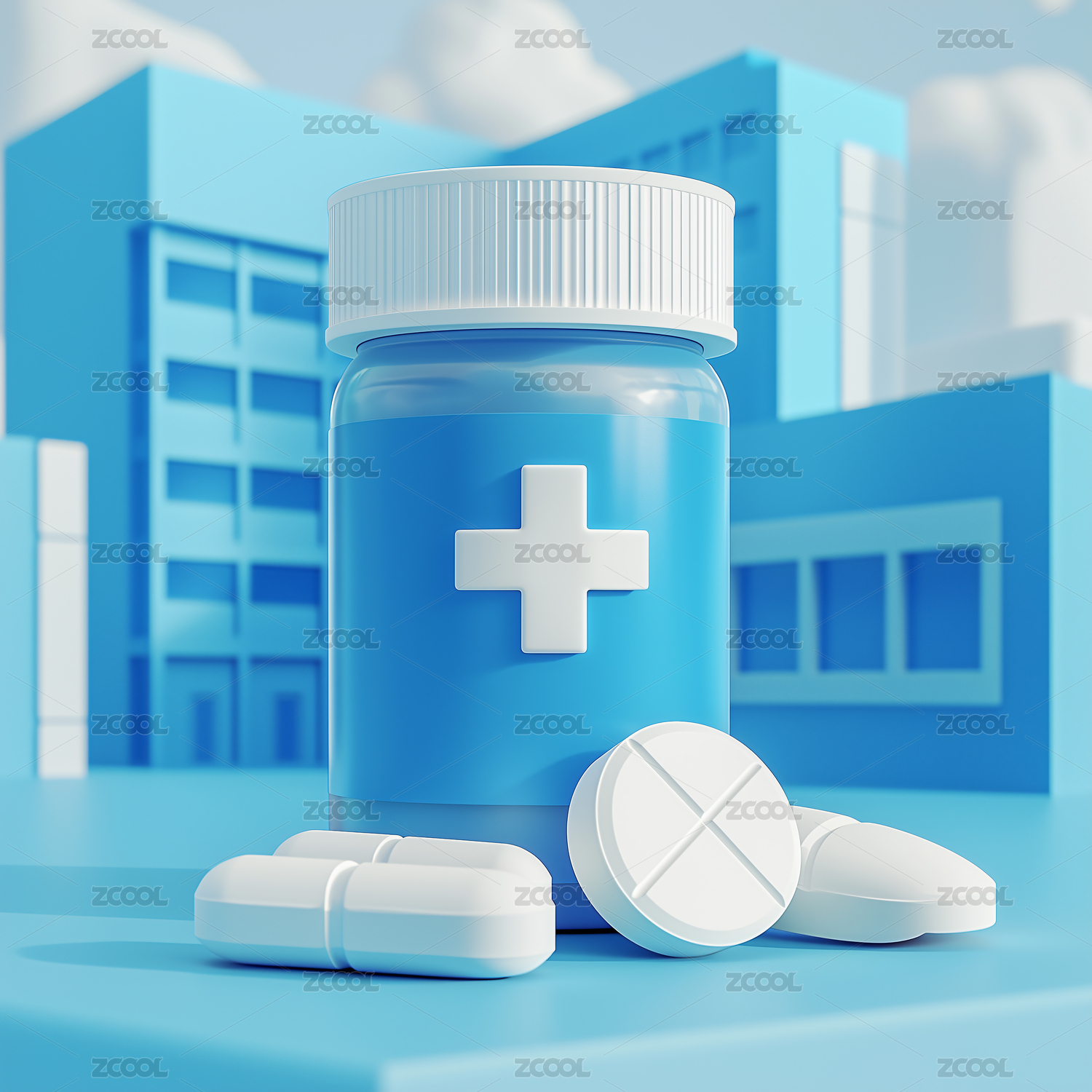 卡通淡蓝色立体医学药品药瓶胶囊模型插画