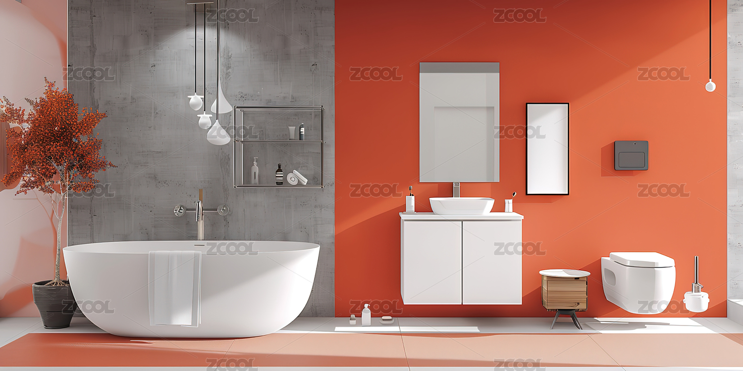 橙色墙、洗漱台和浴缸,卫生间室内设计