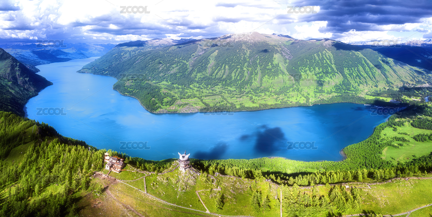 中国新疆阿勒泰喀纳斯湖航拍全景图