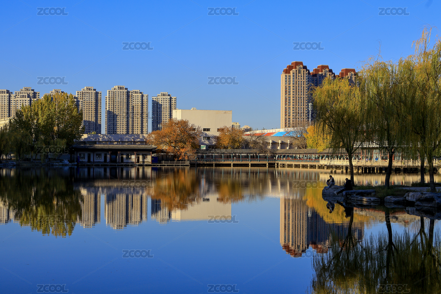 中国新疆克拉玛依河城市建筑江滨公园风光