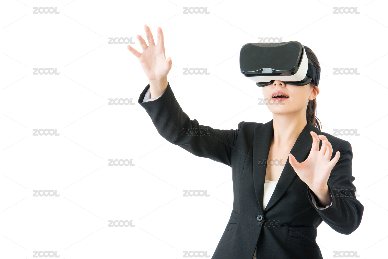 通过虚拟现实亚裔女商人控制。 VR耳机眼镜设备。白色孤立背景