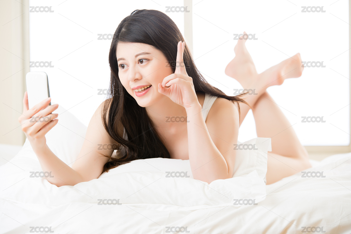 年轻漂亮的亚洲女人在床上采取自拍的智能手机。女孩卧室的背景在家