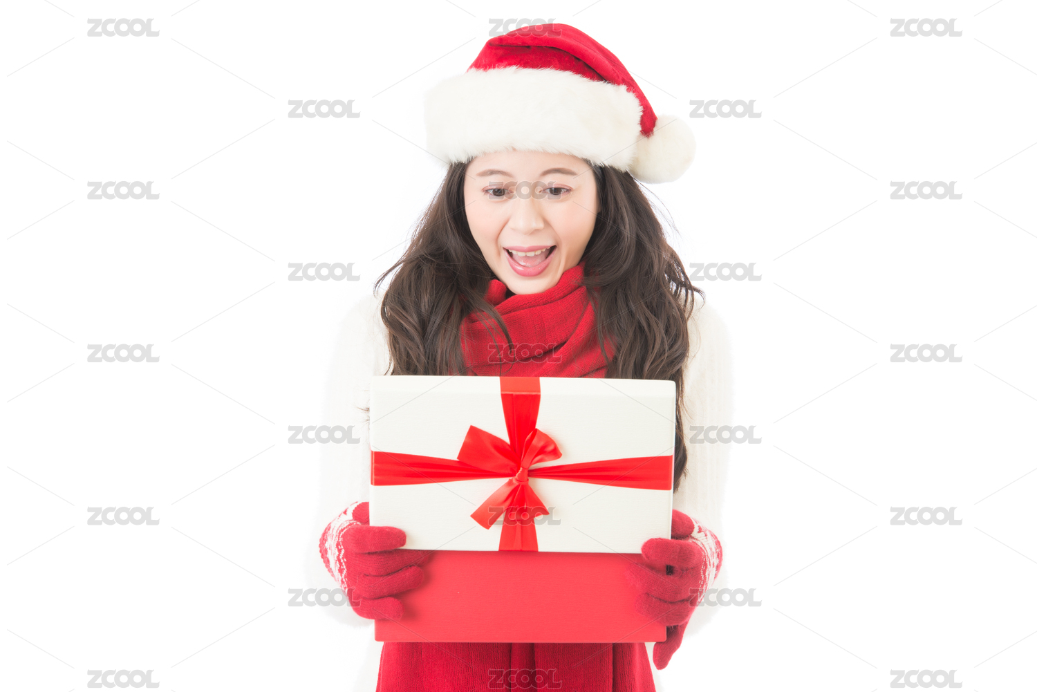 女人的圣诞礼物开幕惊讶和高兴,在圣诞老人的帽子年轻漂亮的微笑的女人。亚洲女人的滑稽可爱的照片隔绝在白色背景
