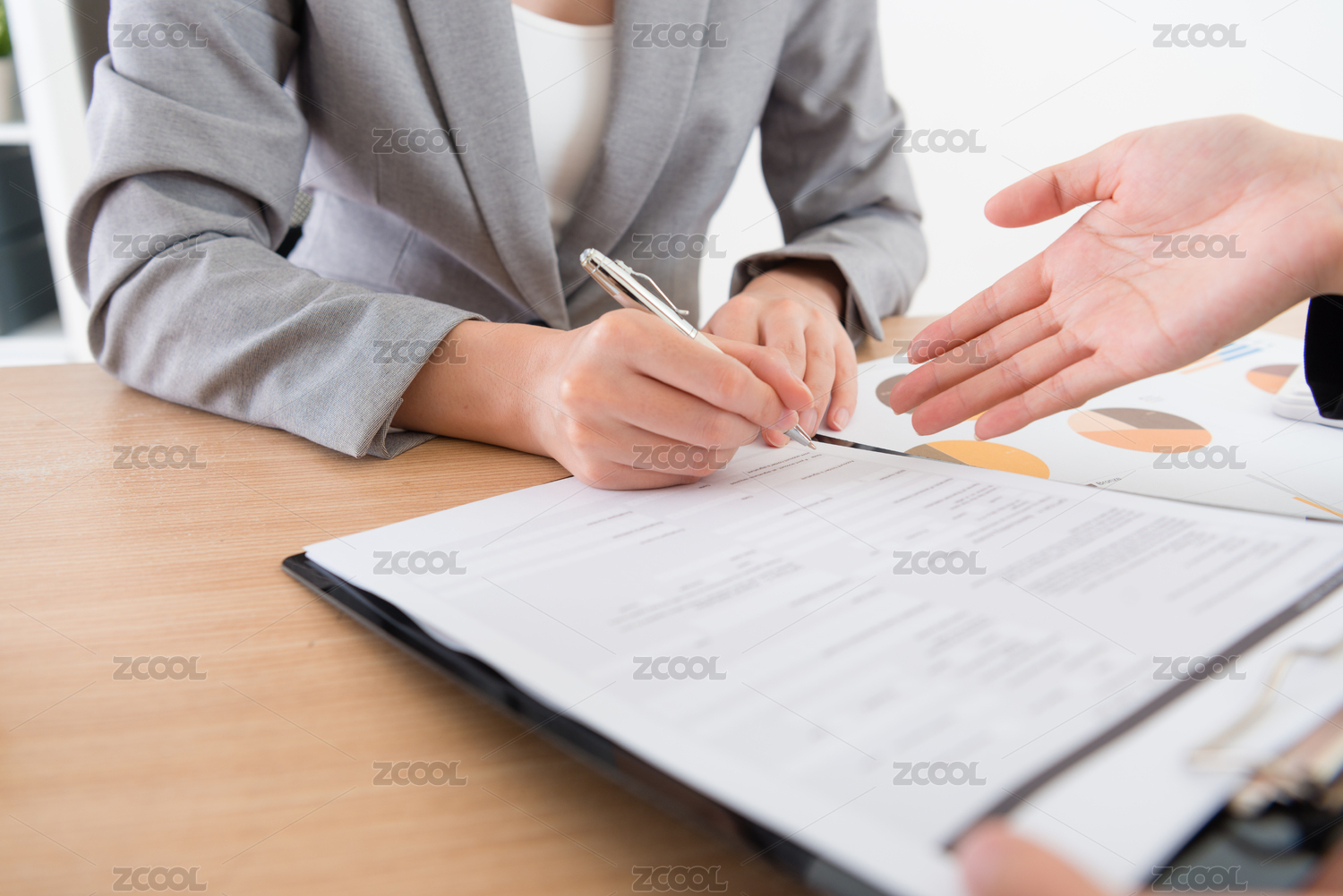 在桌子上的办公TWP商业女性写作合同的特写照片。在正在处理洽谈业务。合伙会议的概念。