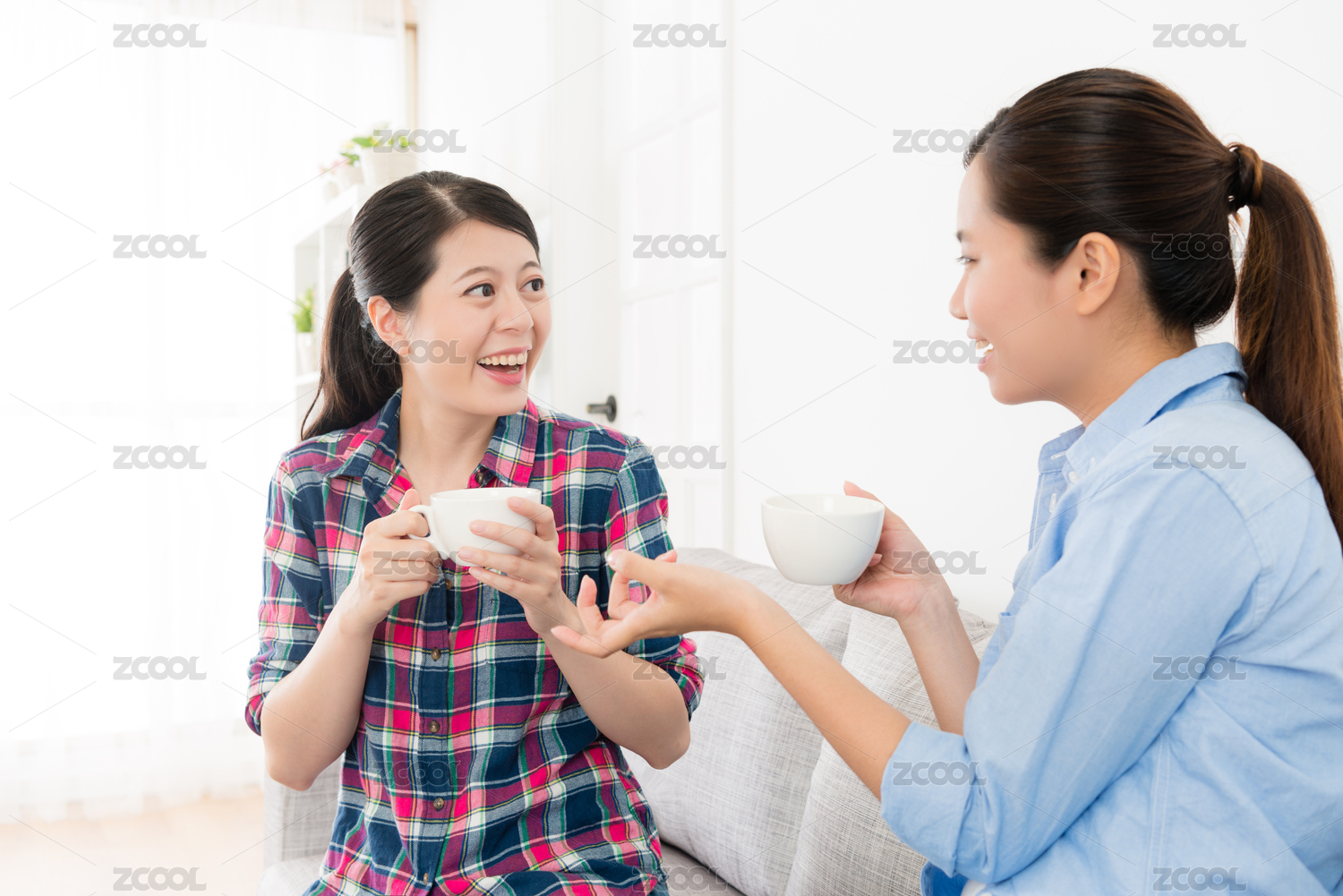 悠闲的漂亮女孩坐在客厅沙发上,一起聊天,喝热咖啡聊天,享受下午茶时间。
