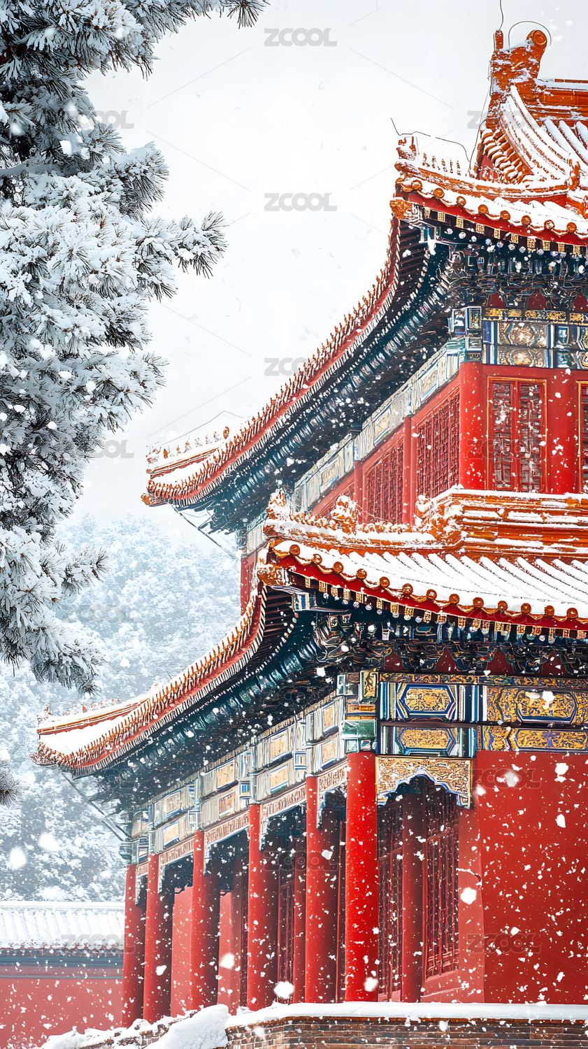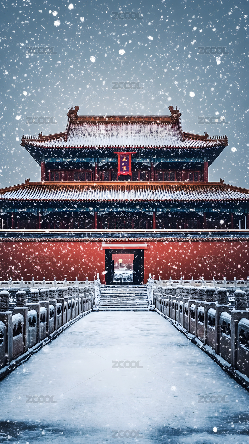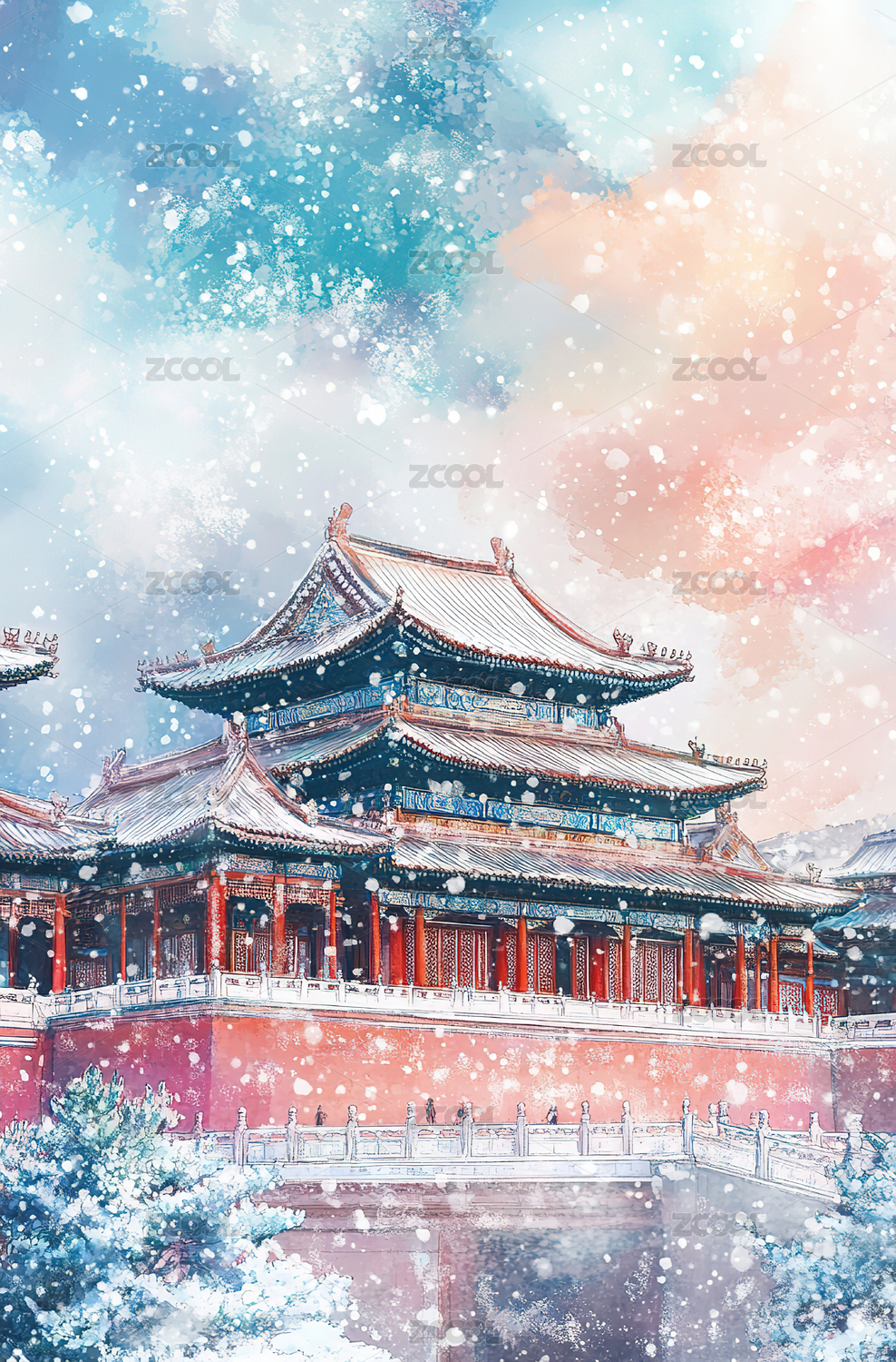 中式红墙古建筑冬季大雪纷飞雪景插画插图