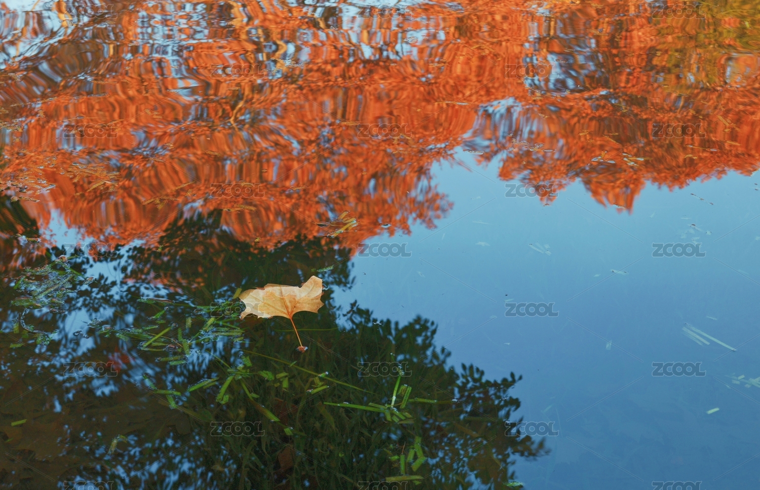 漂在有红色枫叶倒影的水面上的黄色枯叶