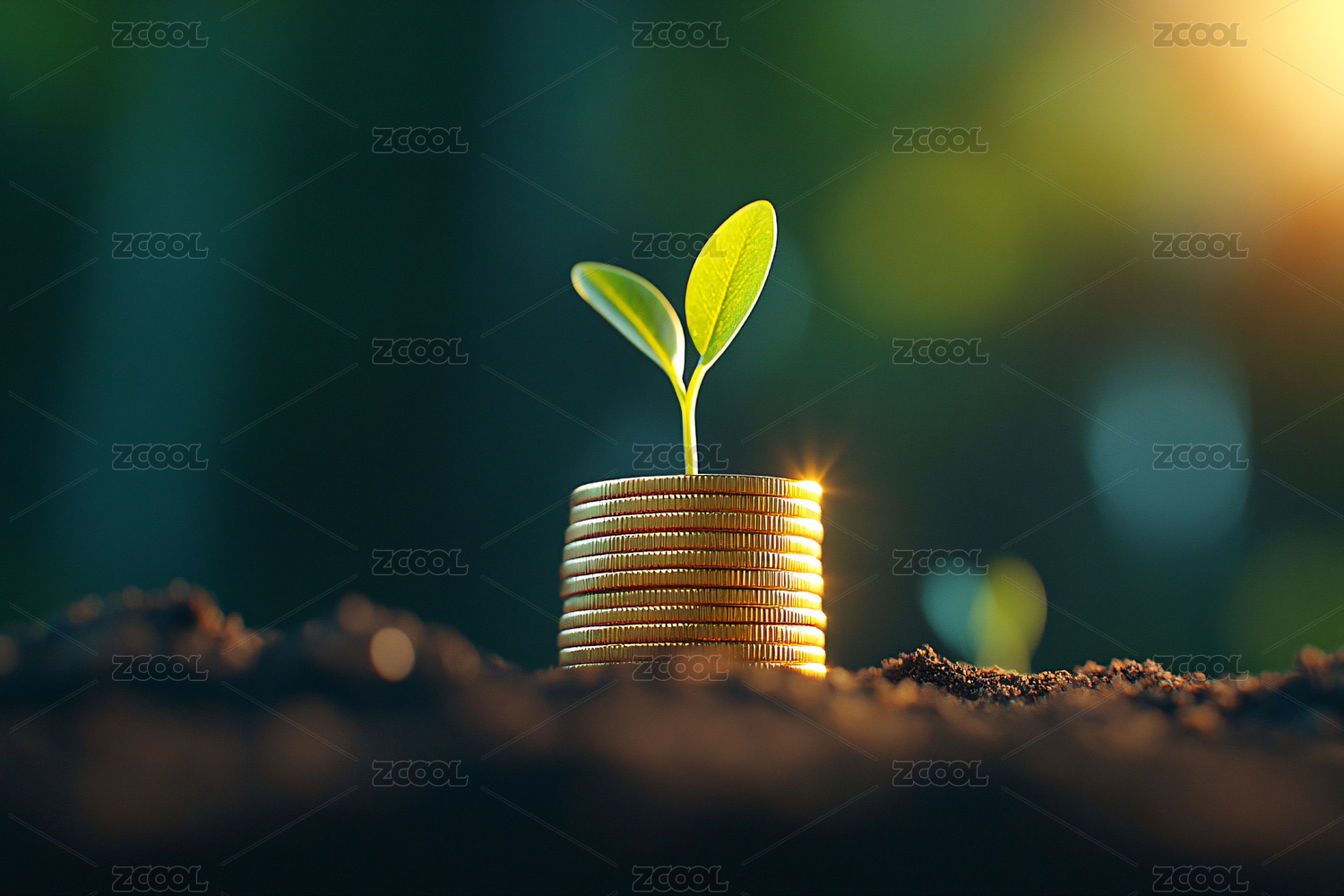 幼苗生长于硬币堆映绿植