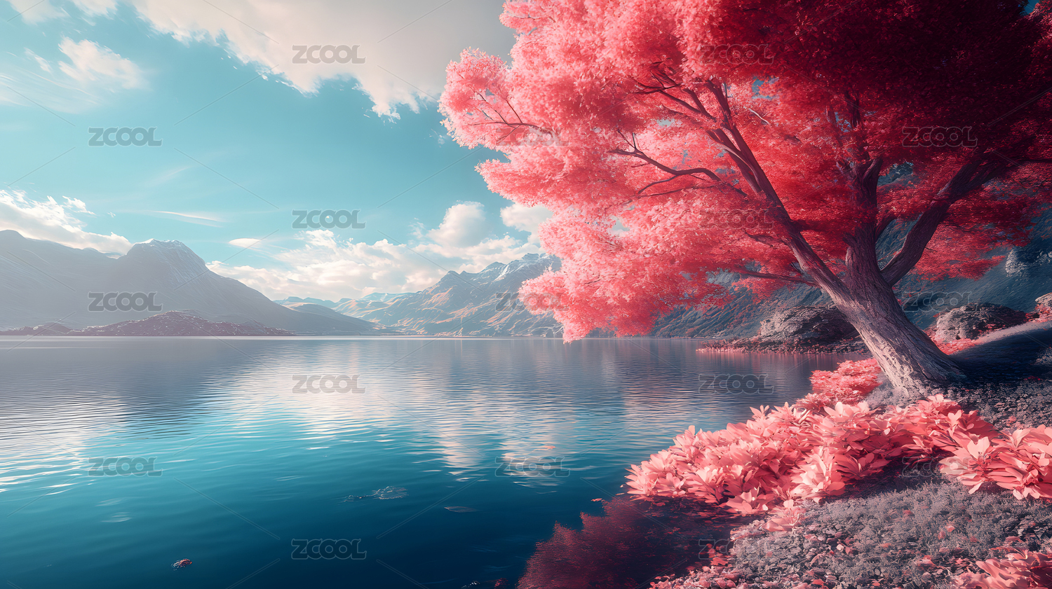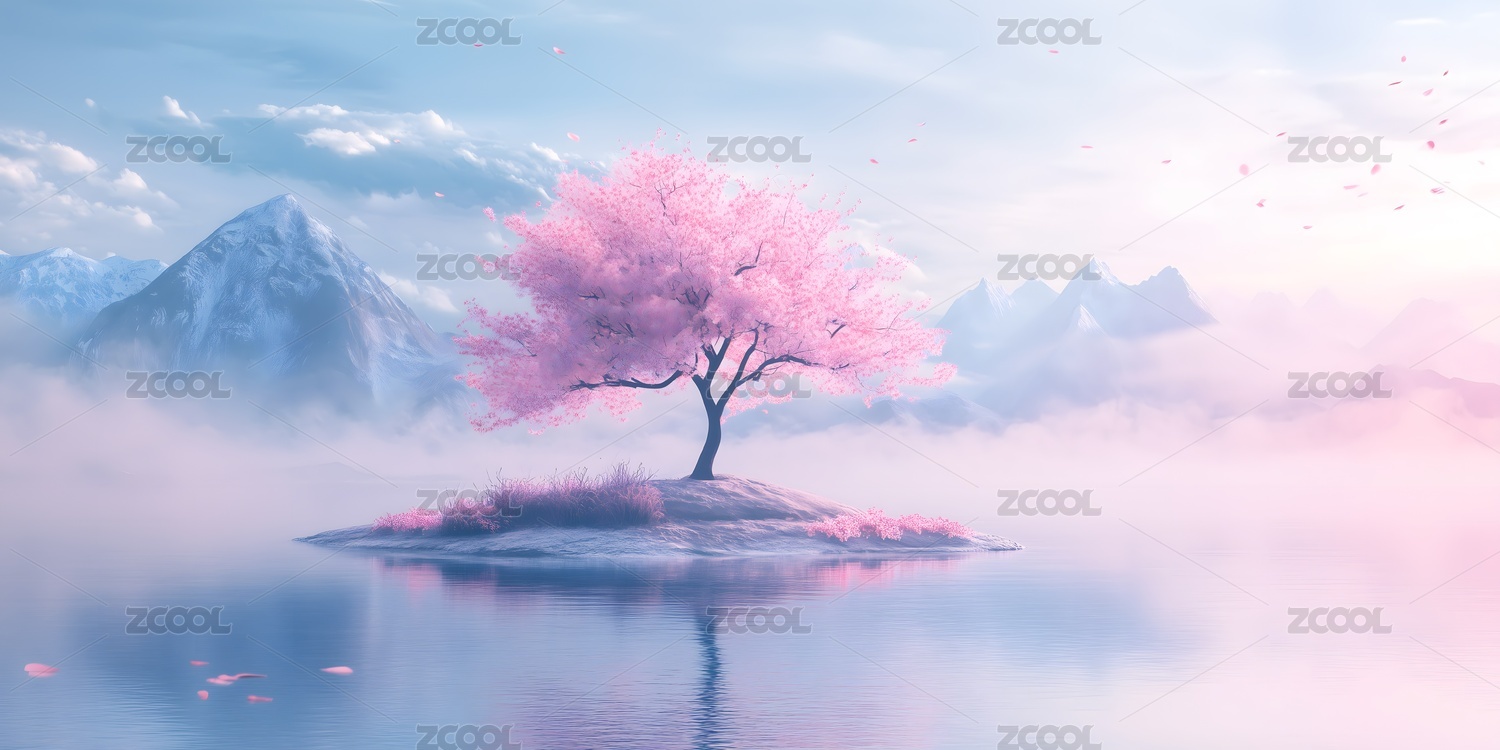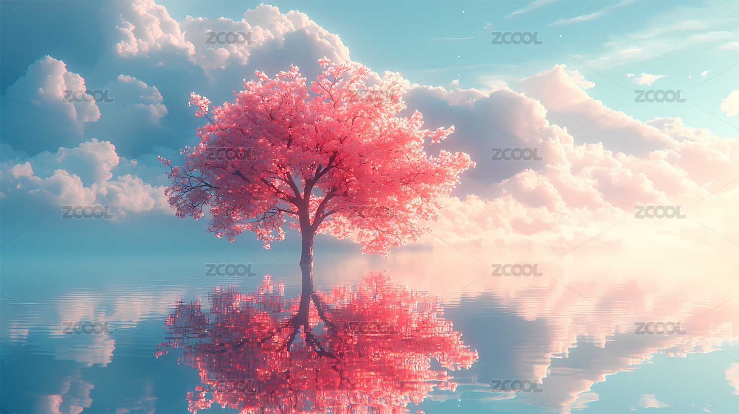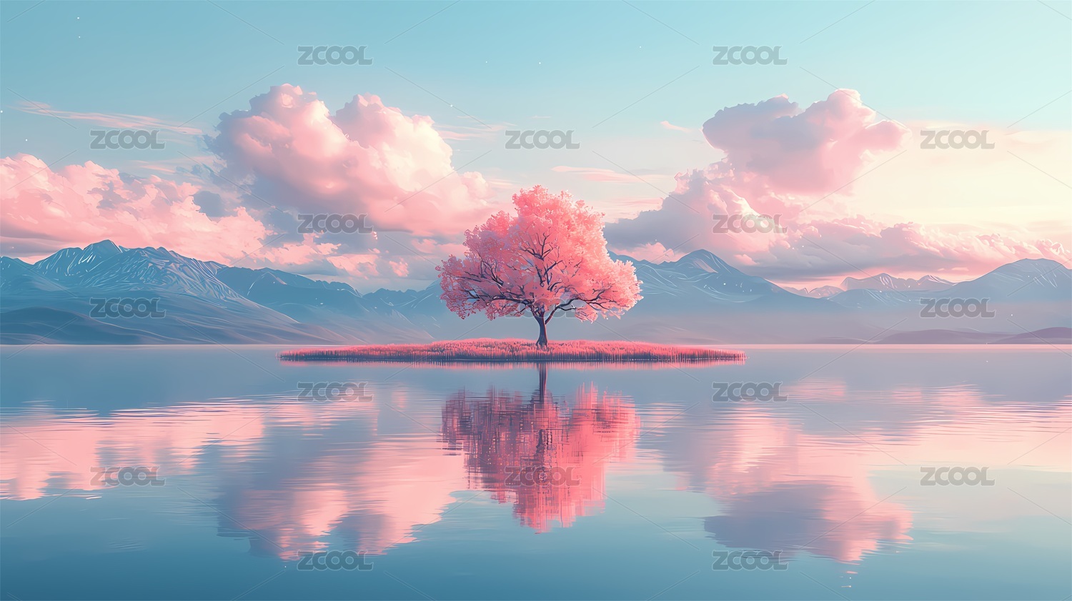 背景,高清,3d,立体,空间,树,粉色,水,海水,山