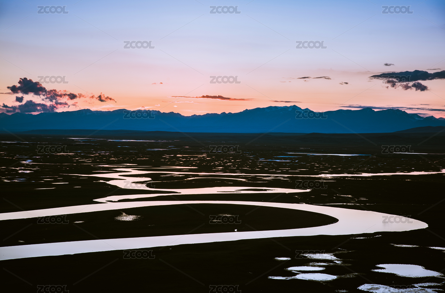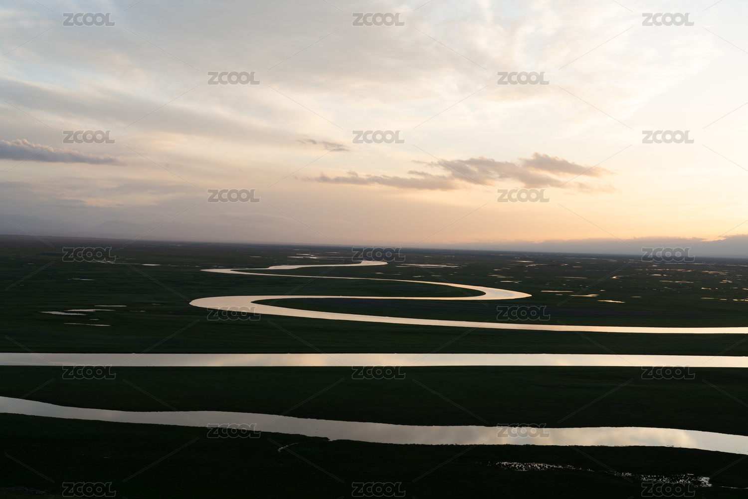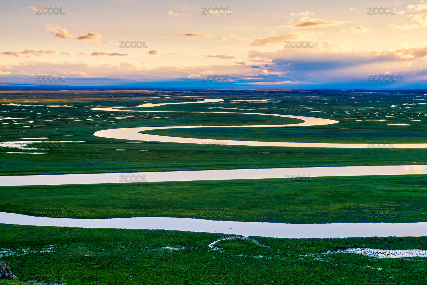 日落时分的中国新疆巴音布鲁克草原九曲回肠