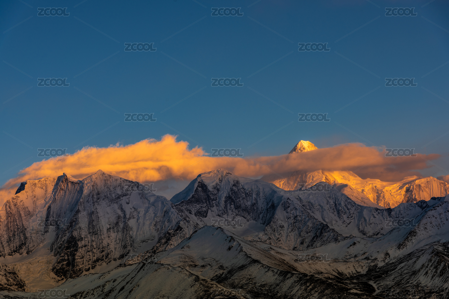黎明霞光照亮群山雪山